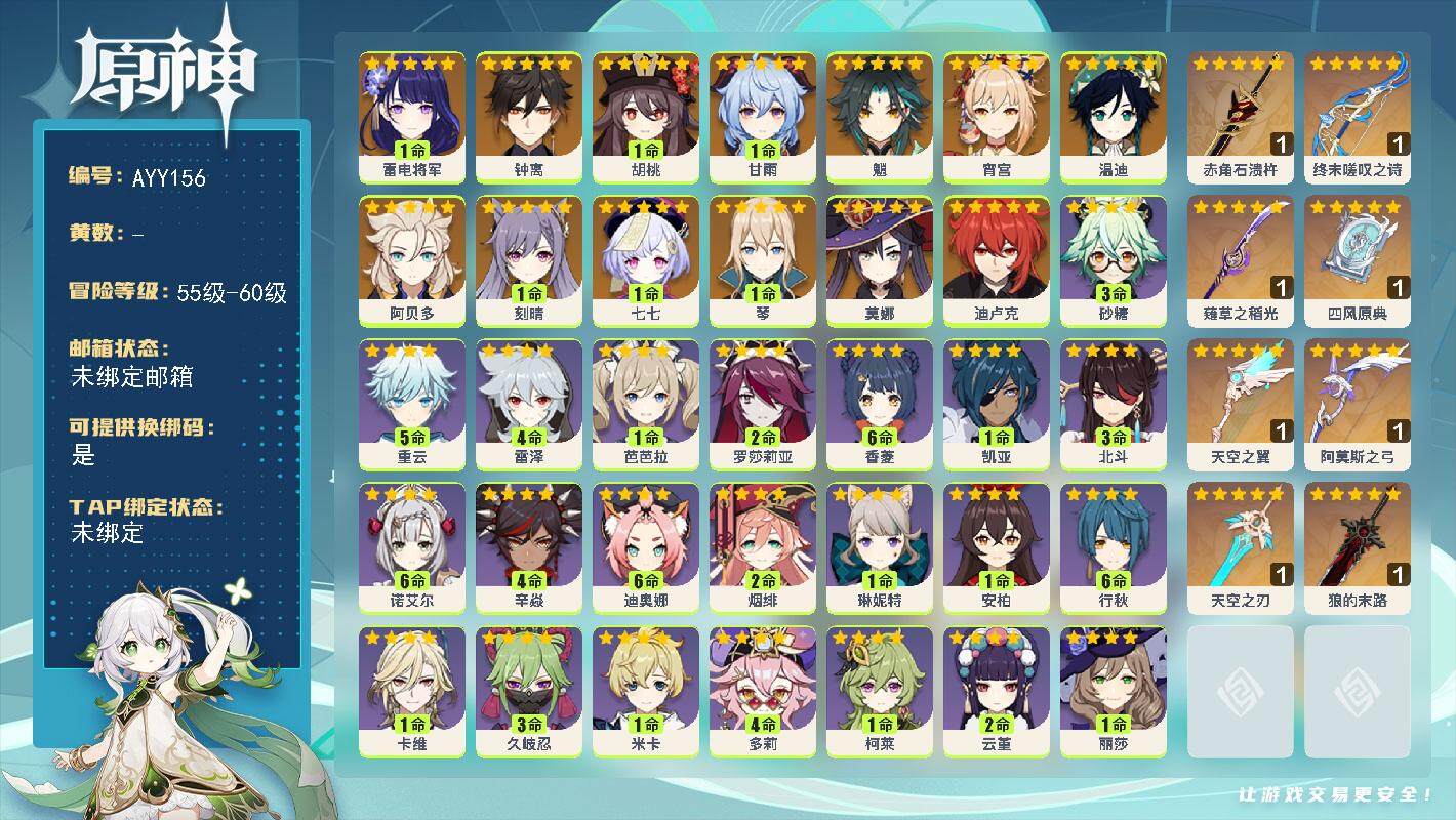 60级/62黄/女主/23个五星角色/17个五星武器0命那维莱特,0命纳西妲
