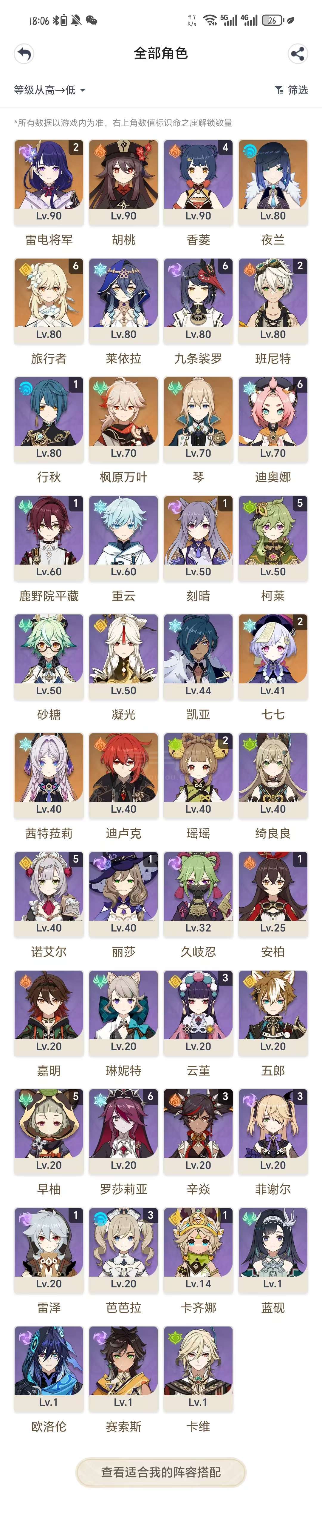 八重6+5,凌人6+1,雷神3+1,草神2+1,水神2+0,龙王1+1,夜兰2+1,宵宫2+1,胡桃