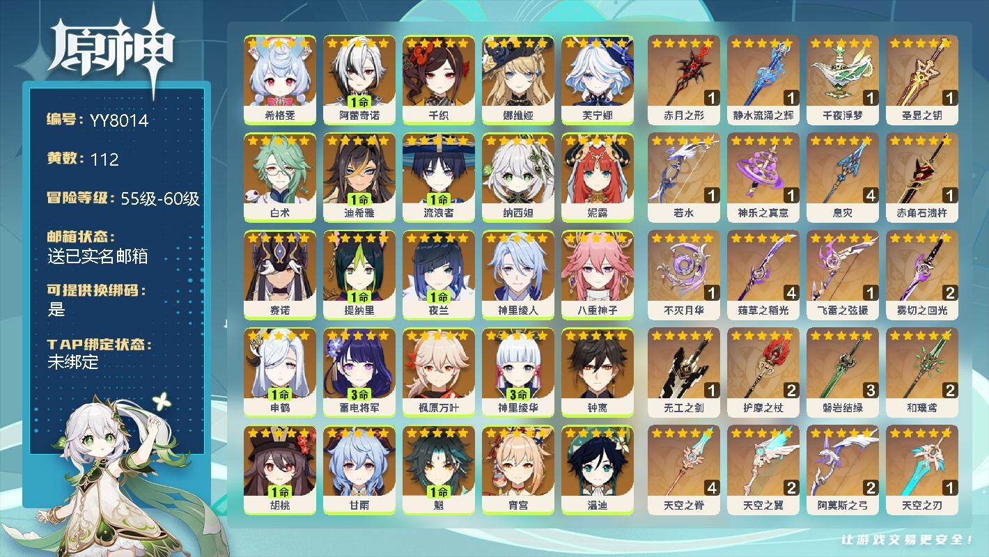 【YY8013】60级/79黄/女主/31个五星角色 0命娜维娅,2命芙宁娜,