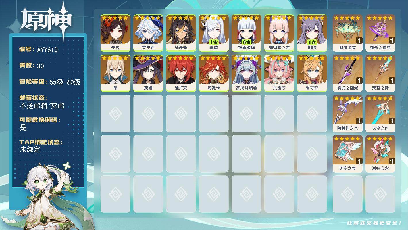 60级/39黄/女主/19个五星角色/6个五星武器0命那维莱特,2命纳西妲,0命提