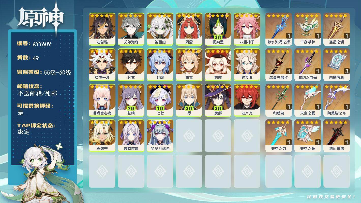 60级/49黄/男主/21个五星角色/14个五星武器0命迪希雅,0命艾尔海森,0命