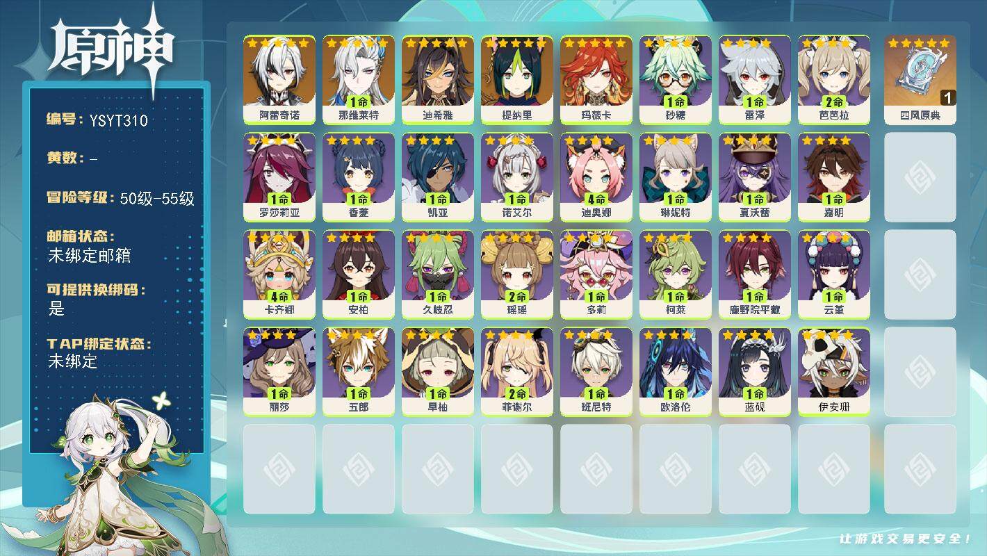 50级/6黄/女主/6个五星角色/提纳里/0命丝柯克/刻晴/梦见月瑞希/0命菲林斯/阿蕾奇诺