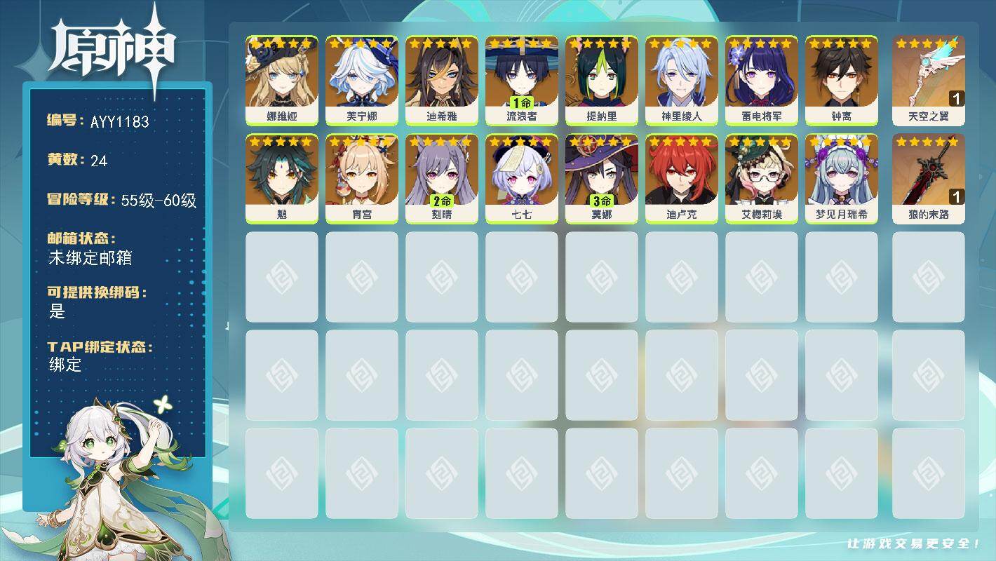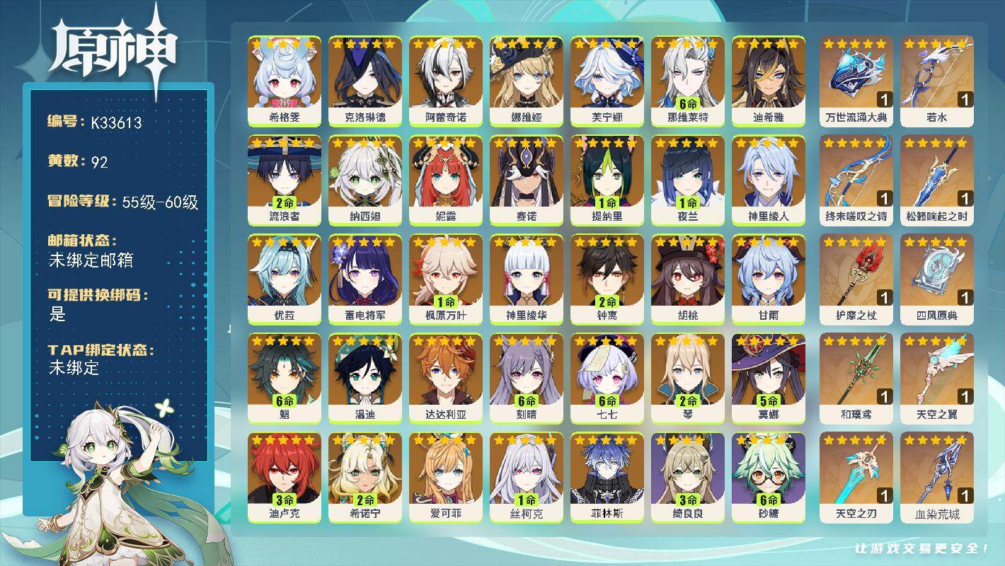 60级/46黄/女主/24个五星角色/10个五星武器/钟离/0命奈