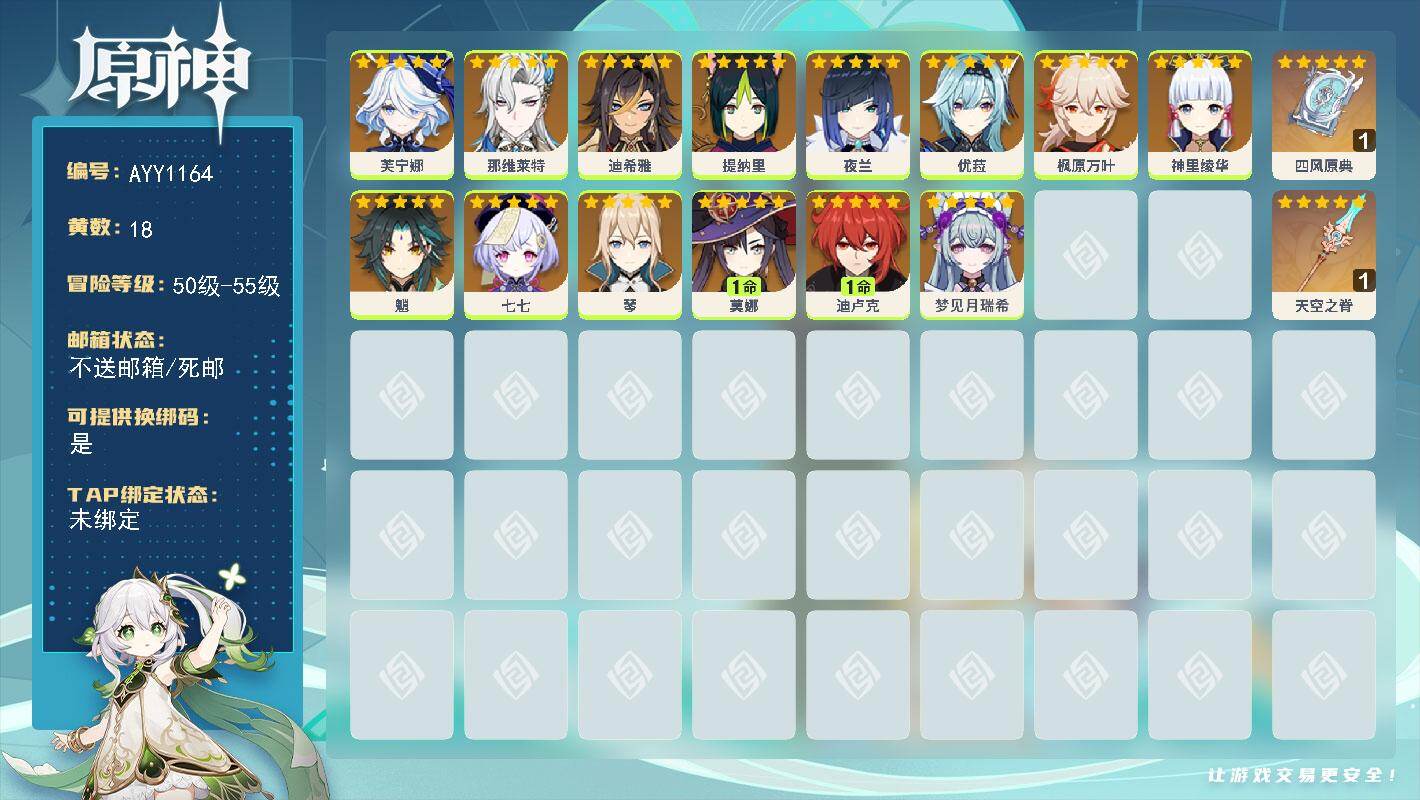 55级/18黄/女主/14个五星角色/2个五星武器0命芙宁娜,0命那维莱特,