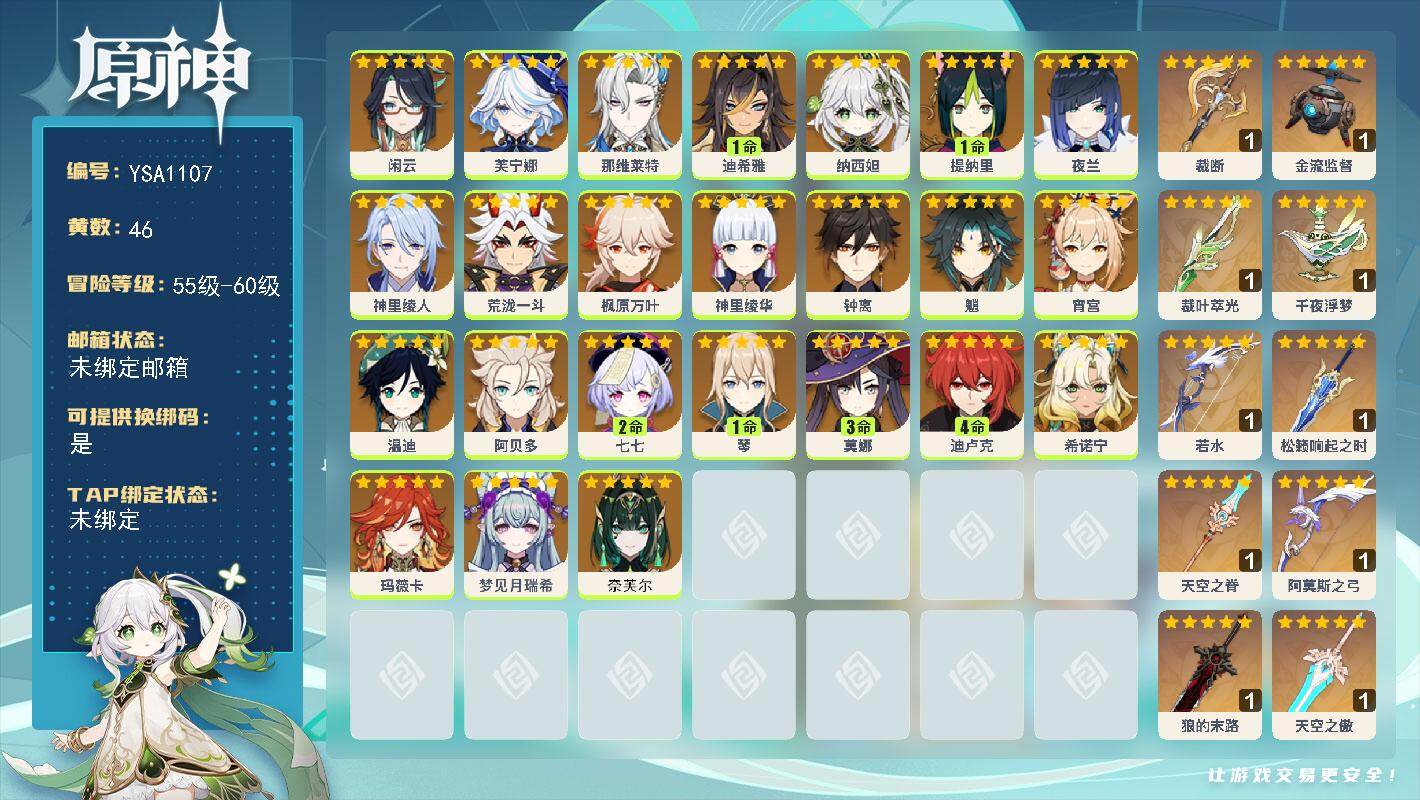 58级/42黄/男主/21个五星角色/8个五星武器0命闲云,0命那维莱特,0命迪希