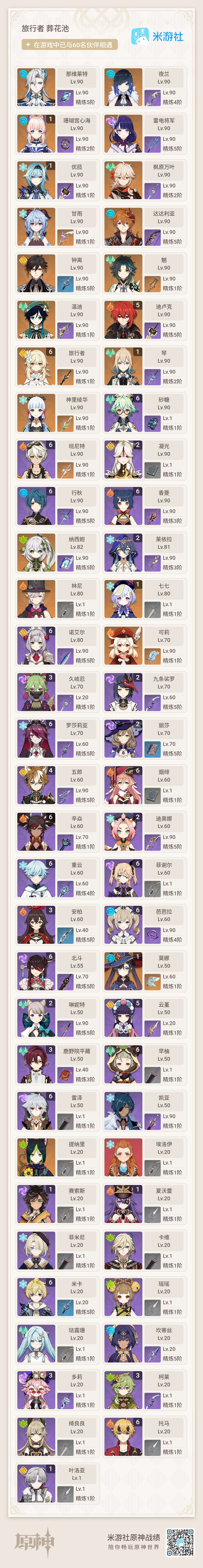 邮箱: 未绑定 总黄数: 42 冒险等级: 59 2命金色角色: 二命提纳里