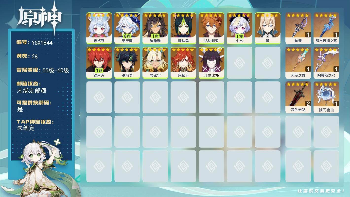 【YSX1908】56级/28黄/女主/20个五星角色/0命哥伦比娅/0命纳西