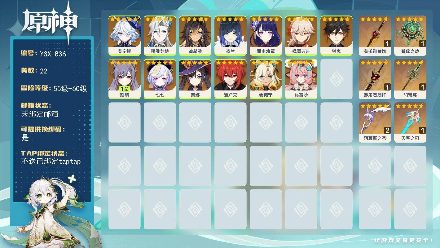 【YSX1836】57级/22黄/女主/13个五星角色/7个五星武器/0命枫原