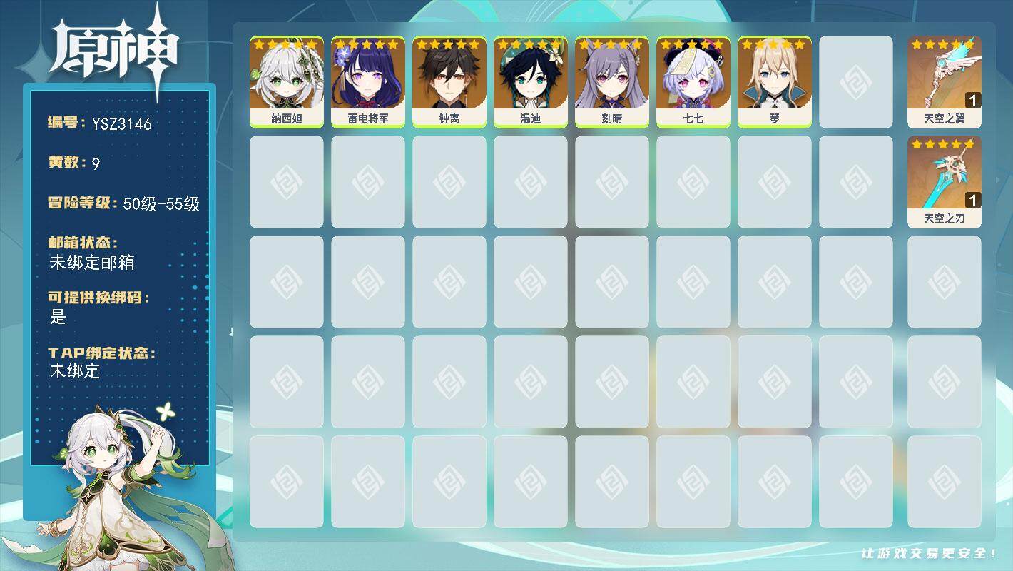 【YSZ3146】53级/9黄/女主/7个五星角色/2个五星武器/0命雷电将军