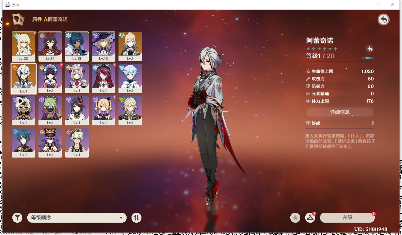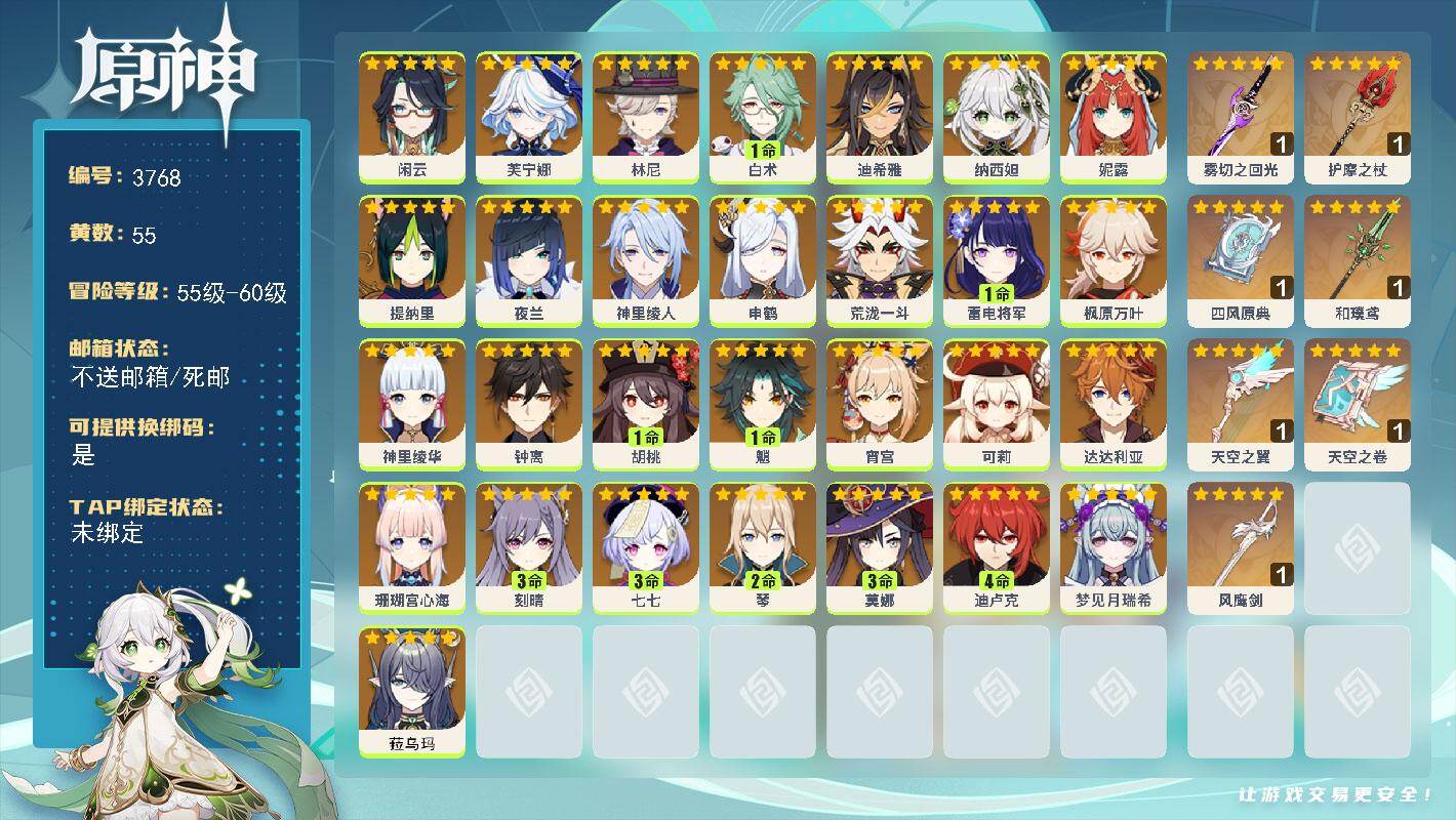 60级/55黄/男主/29个五星角色/7个五星武器0命闲云,0命芙宁娜,0命