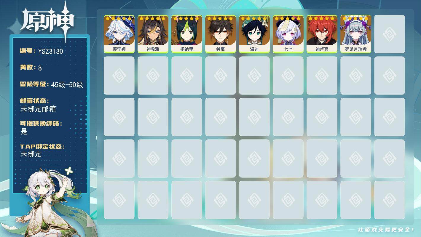 50级/8黄/女主/8个五星角色/梦见月瑞希/钟离/温迪/七七/芙宁娜