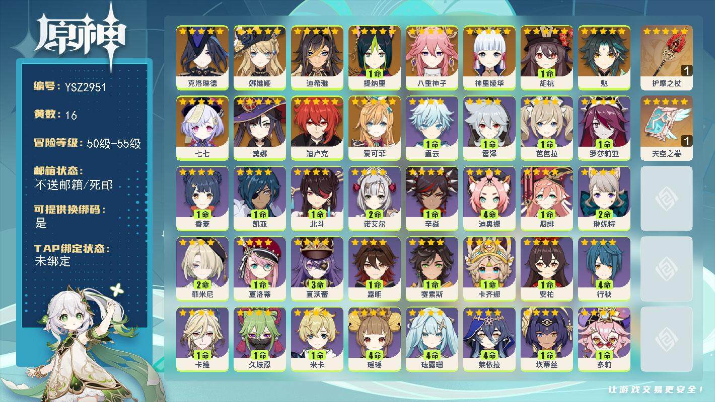 55级/16黄/女主/13个五星角色/3个五星武器/