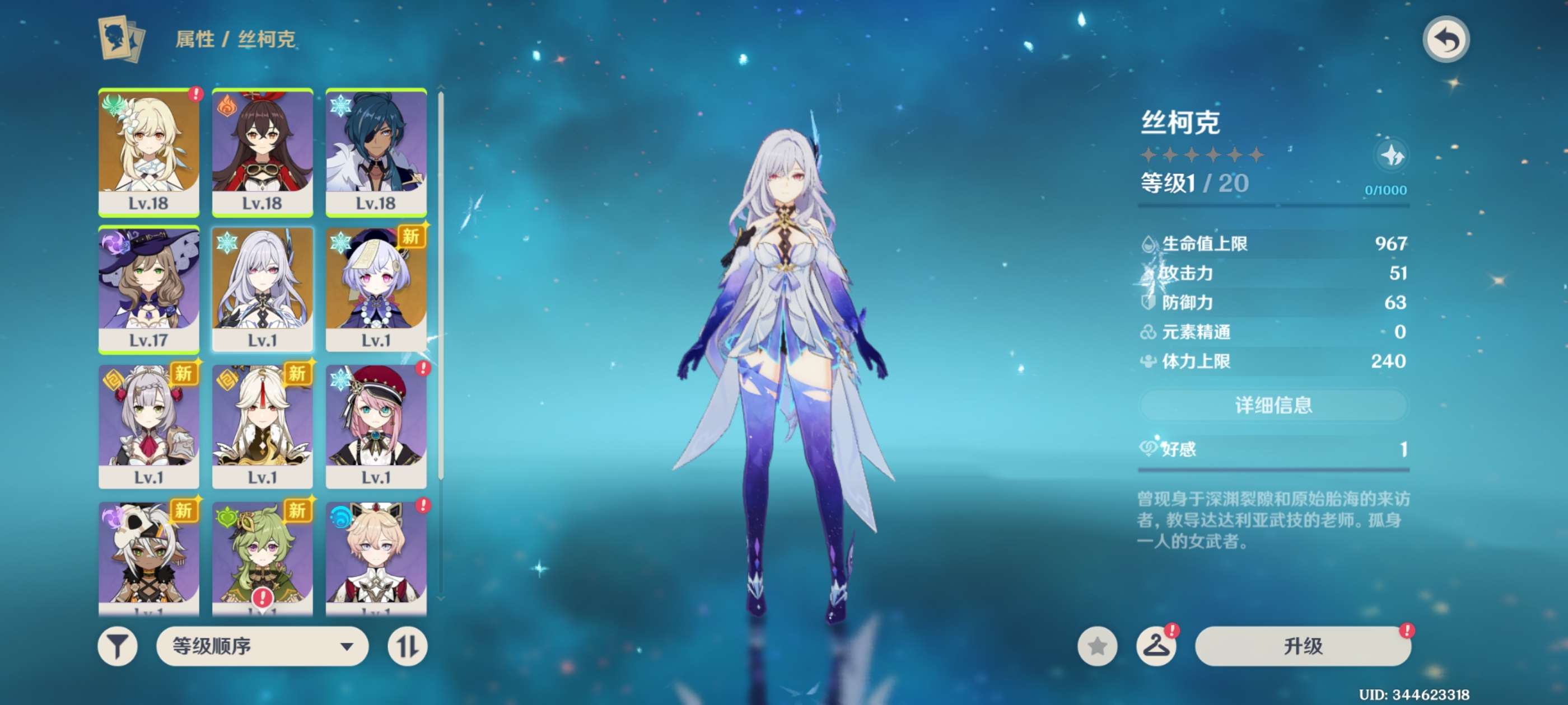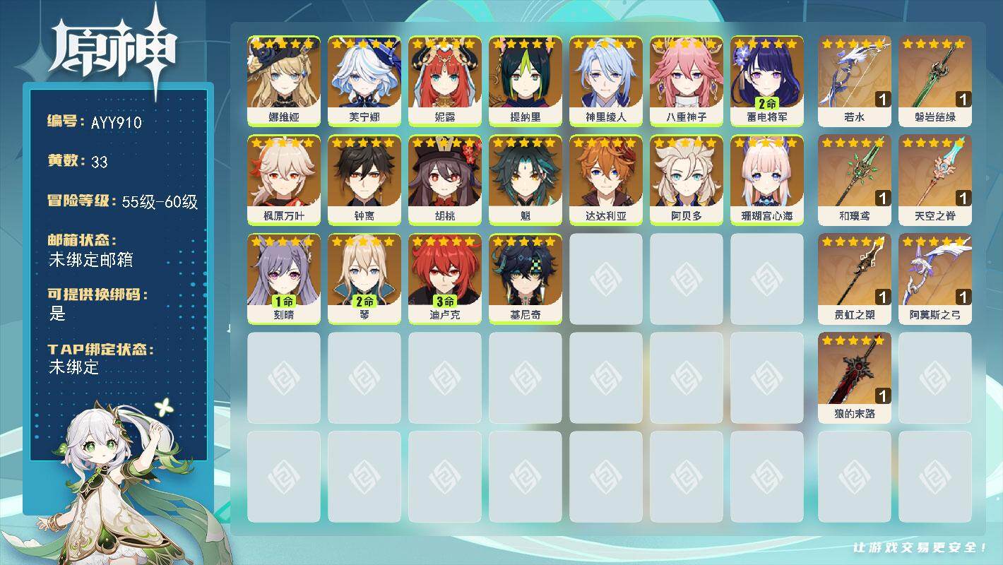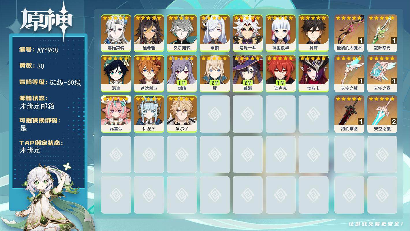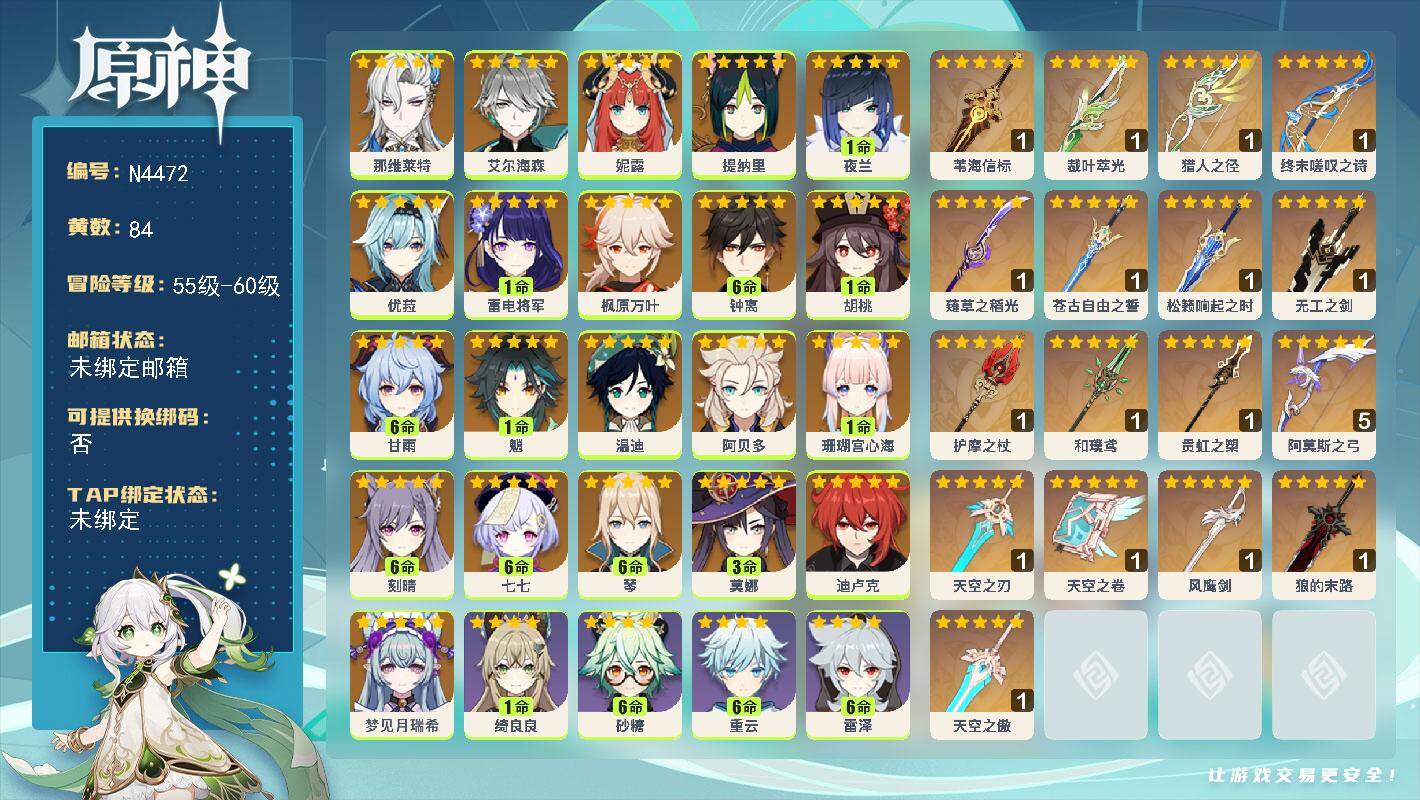 57级/30黄/男主/17个五星角色/6个五星武器0命那维莱特,0命迪希雅