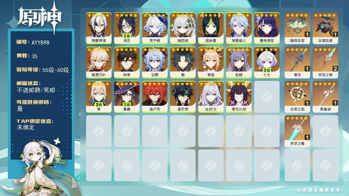 57级/35黄/女主/20个五星角色/7个五星武器0命阿蕾奇诺,1命闲云,0命芙宁