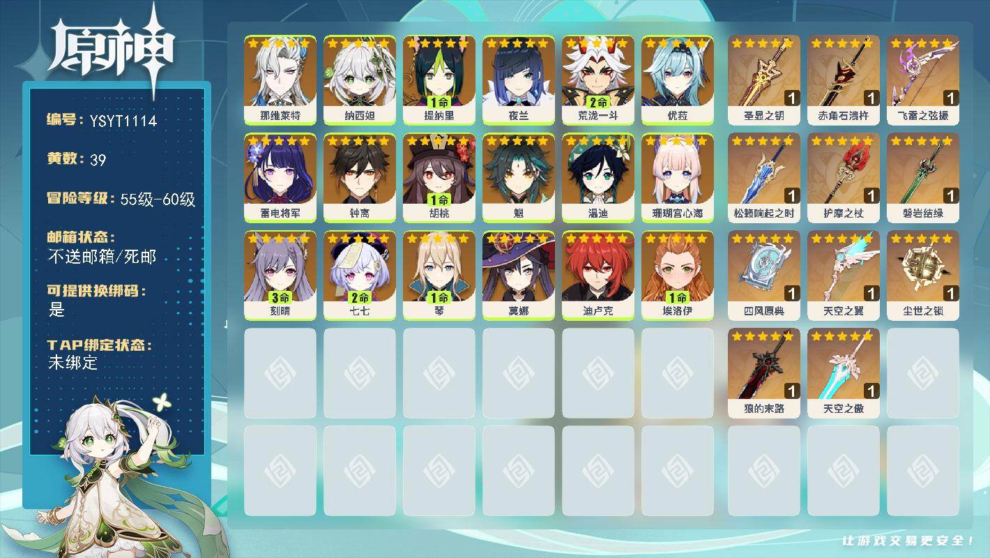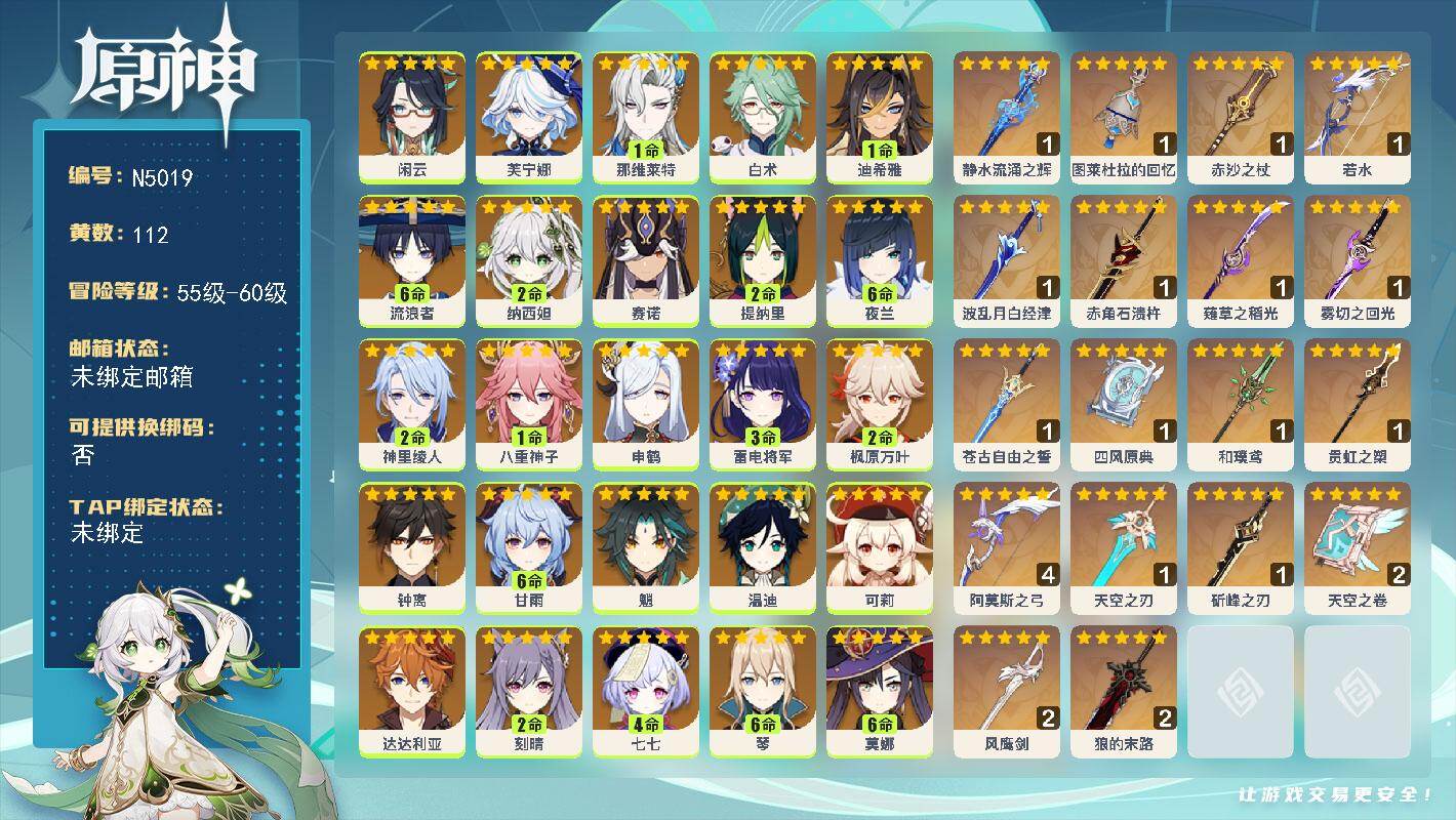 58级/27黄/女主/14个五星角色/9个五星武器0命纳西妲,1命提纳里,0命夜兰