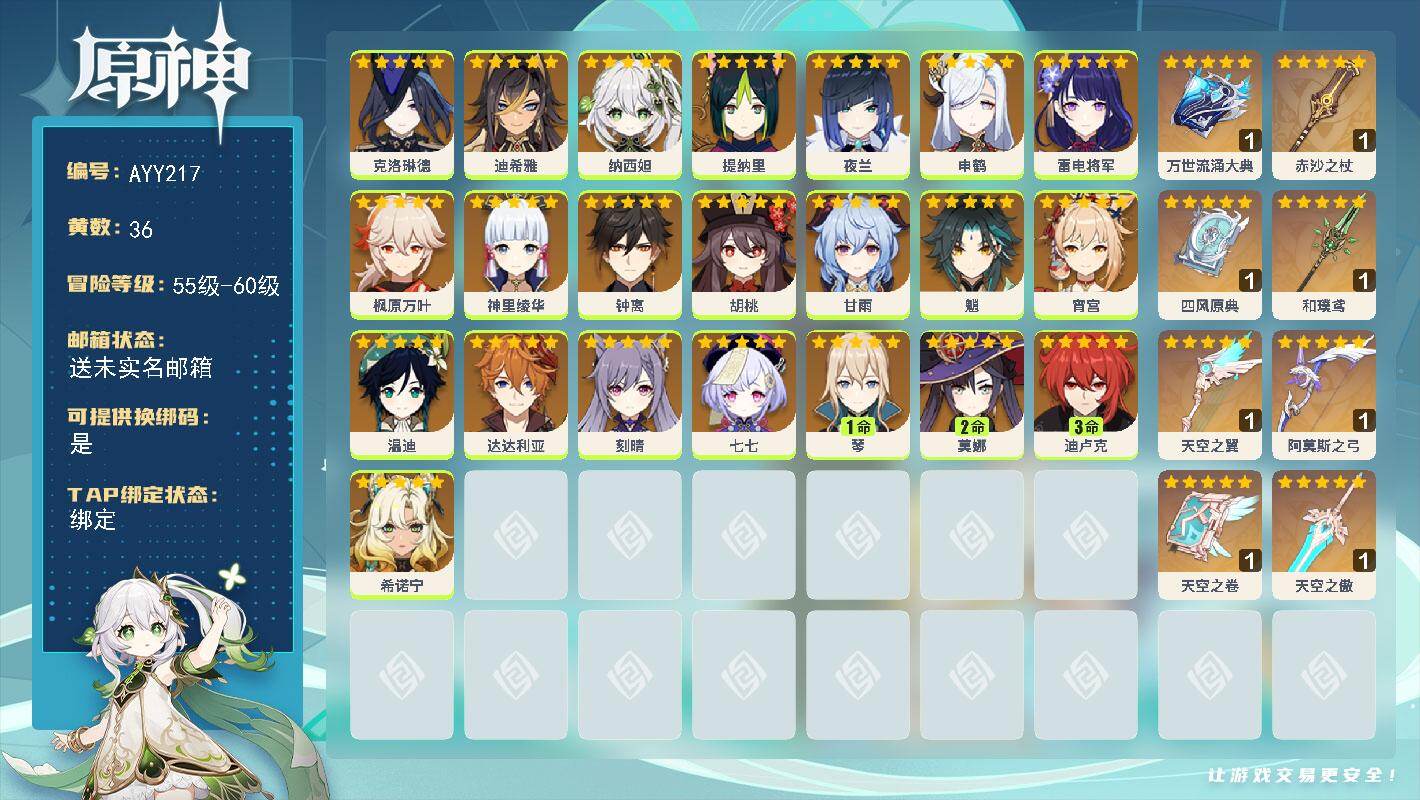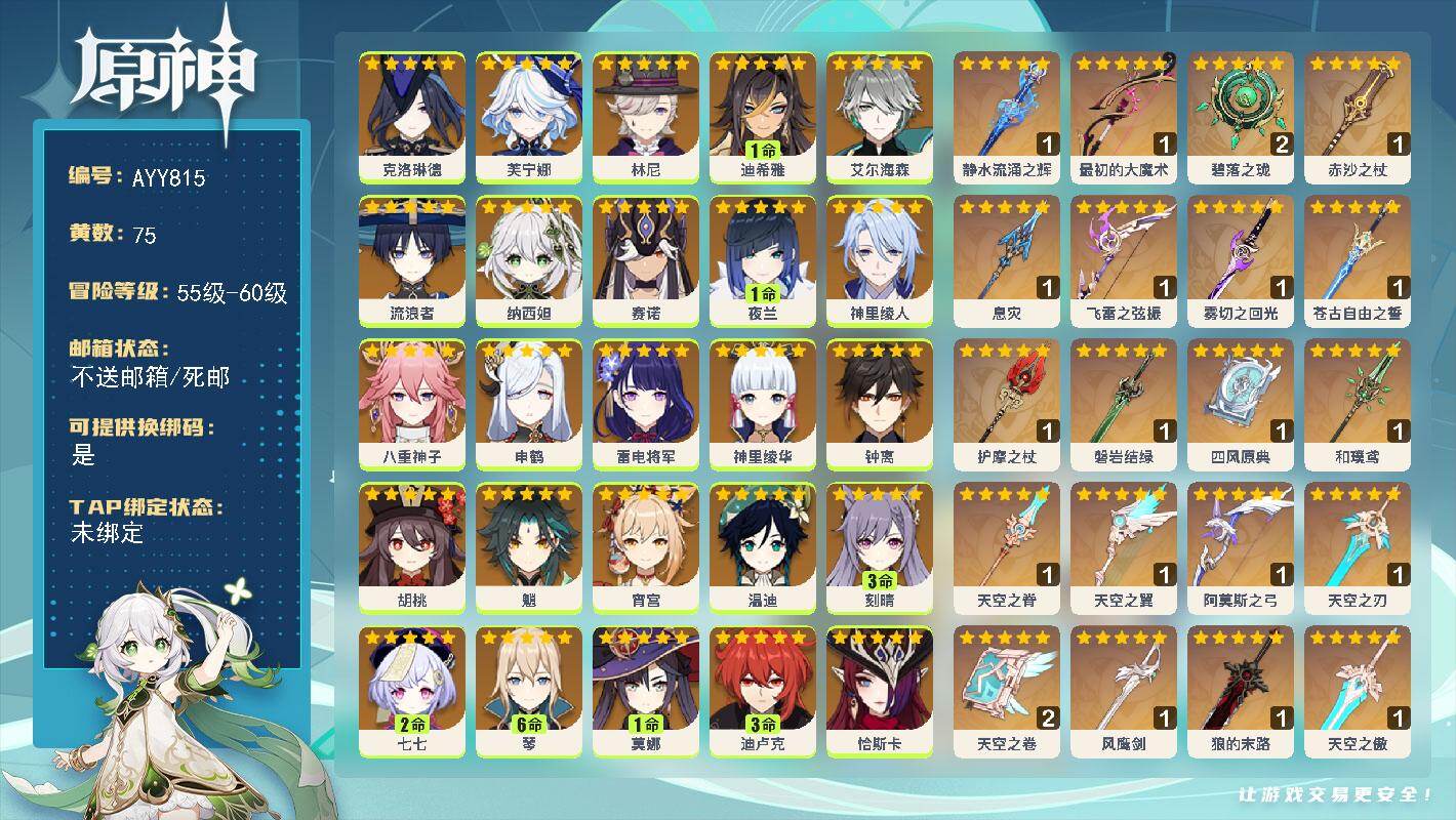 57级/38黄/女主/21个五星角色/8个五星武器0命闲云,0命纳西妲,0命提纳里