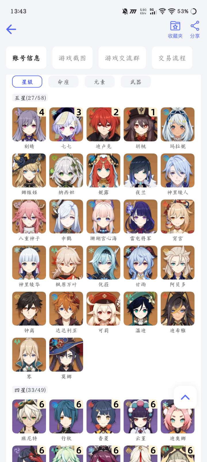 58级/26黄/男主/16个五星角色/4个五星武器0命闲云