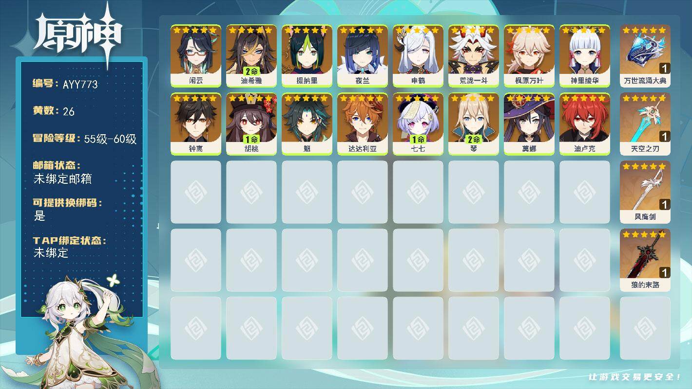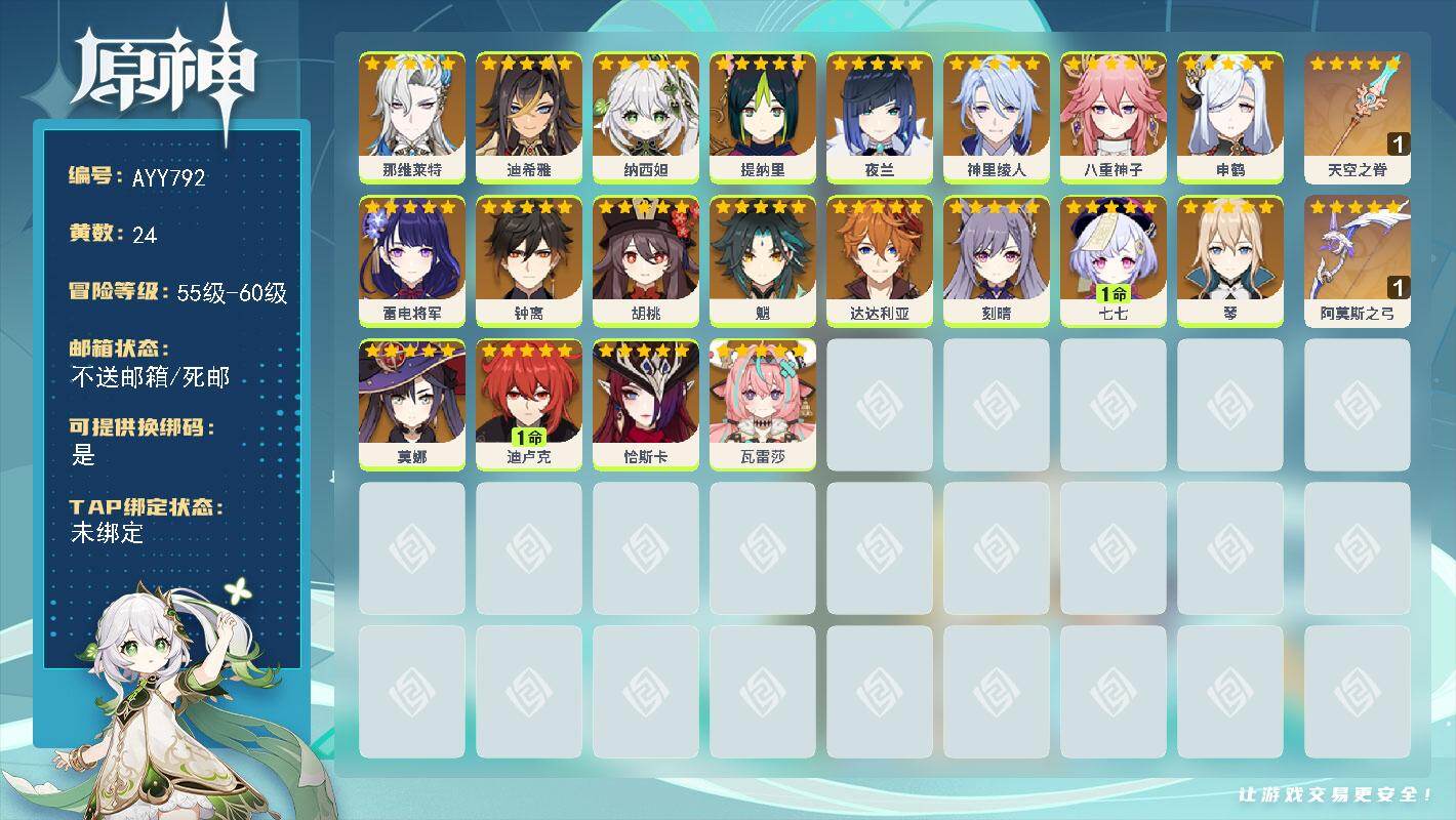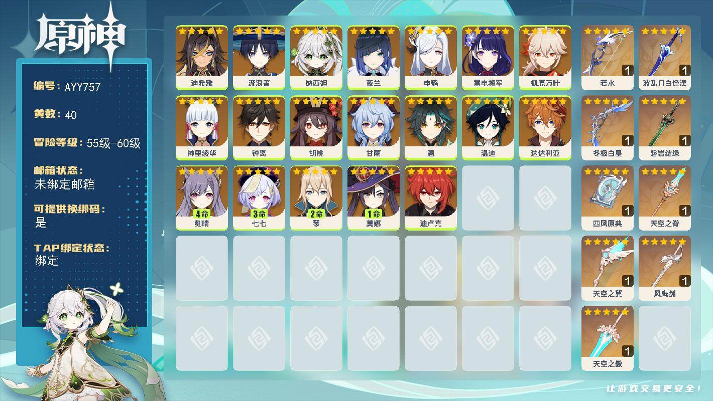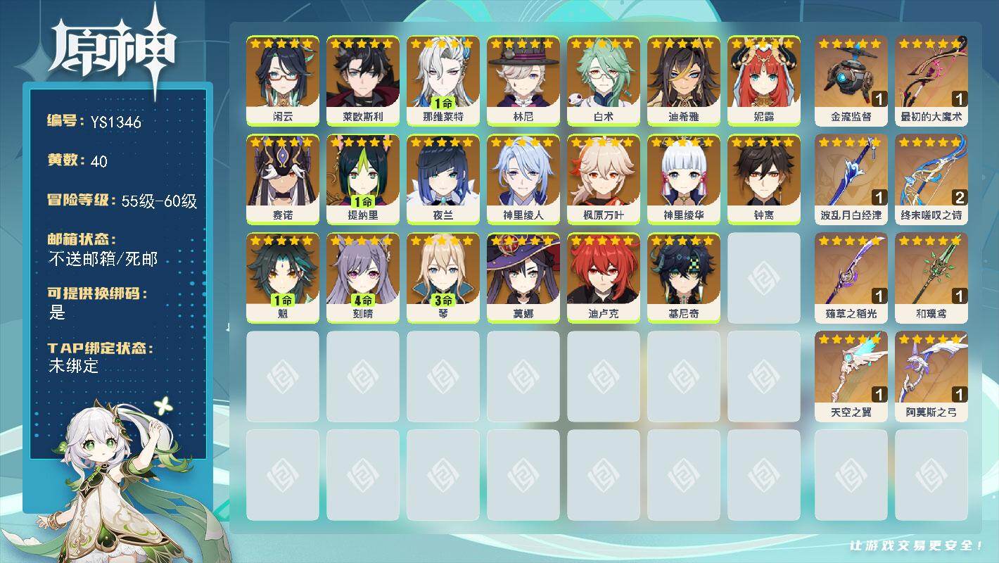 60级/39黄/女主/19个五星角色/11个五星武器0命妮露,0命夜兰,0命