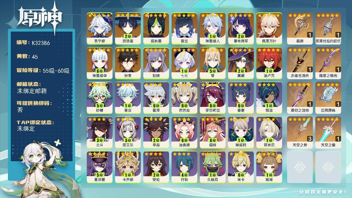 60级/32黄/女主/19个五星角色/6个五星武器0命迪希雅,0命艾尔海森,0命妮