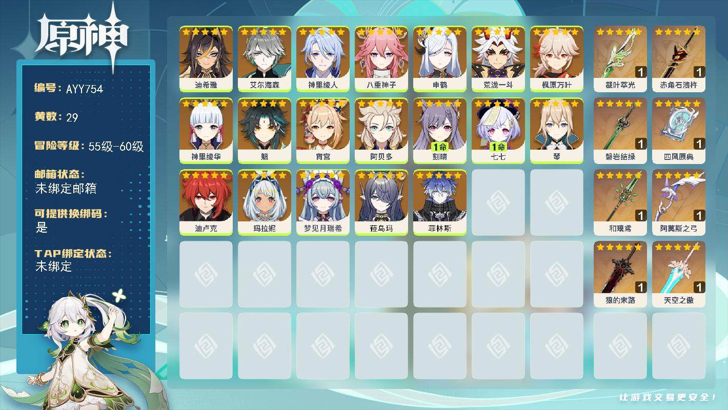 58级/30黄/男主/14个五星角色/7个五星武器0命迪希雅,0命纳西妲,0命夜兰