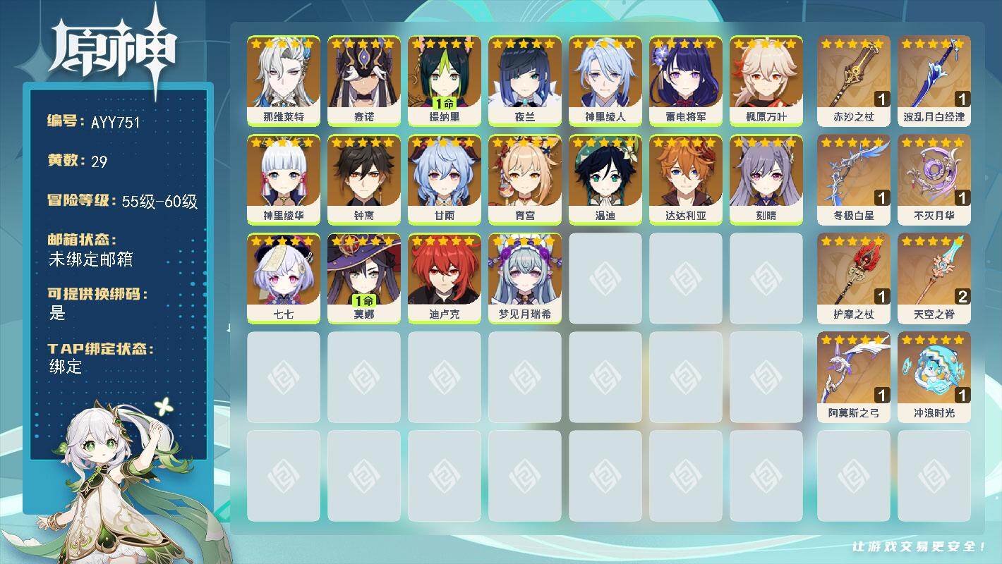 57级/29黄/男主/18个五星角色/8个五星武器0命那维莱特,0命赛诺,1命提纳