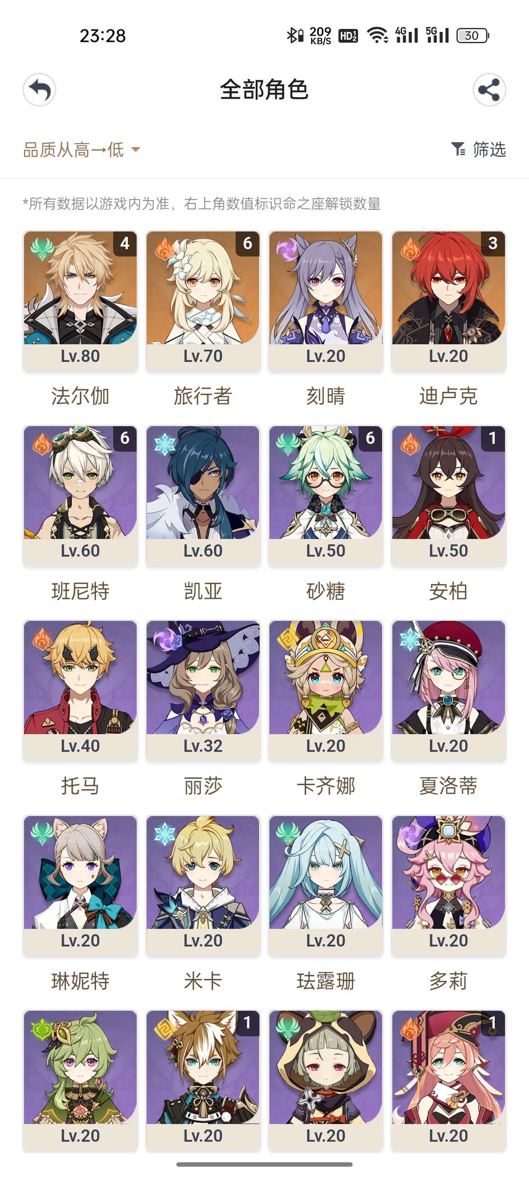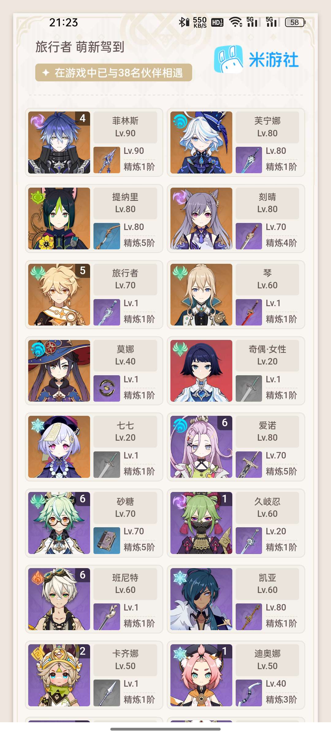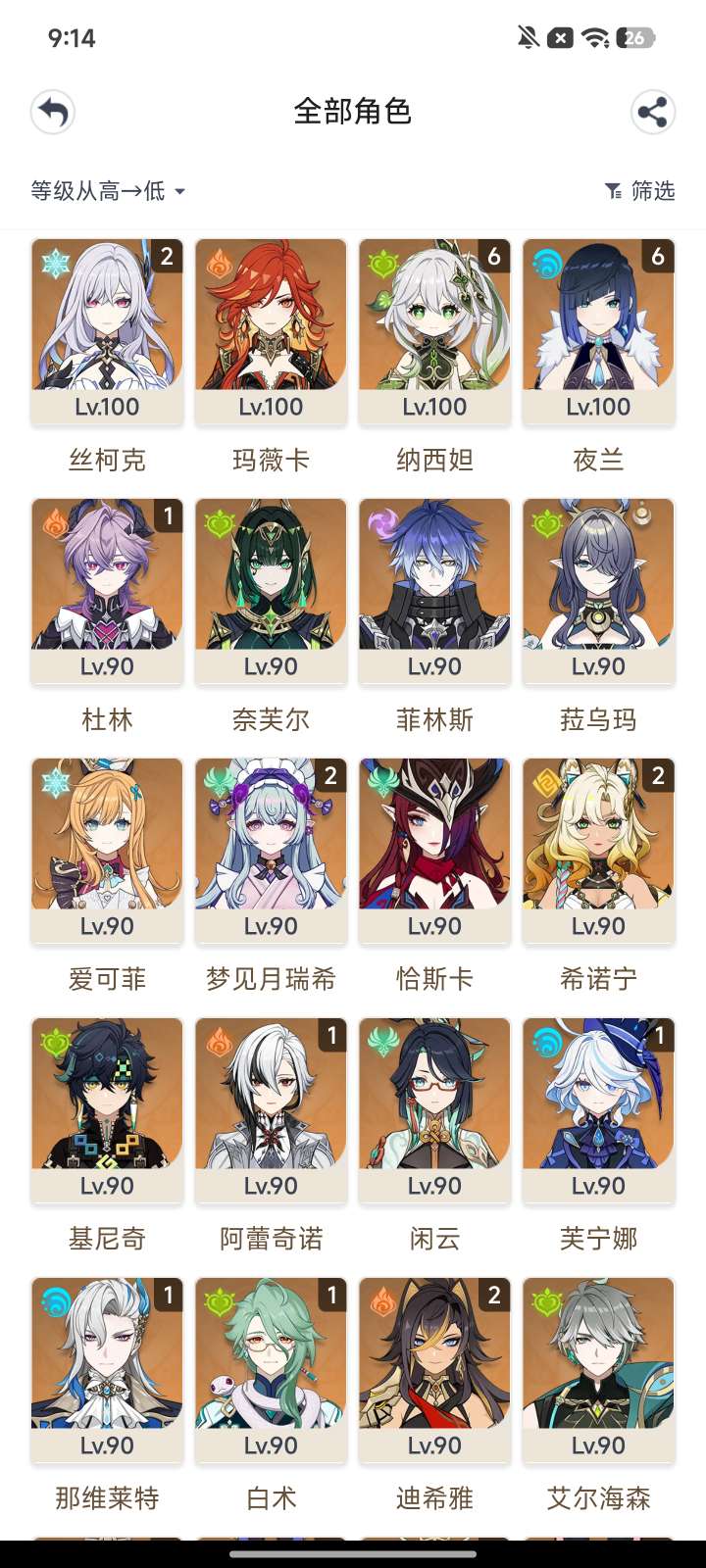 59级/34黄/女主/13个五星角色/9个五星武器/1命夜兰/