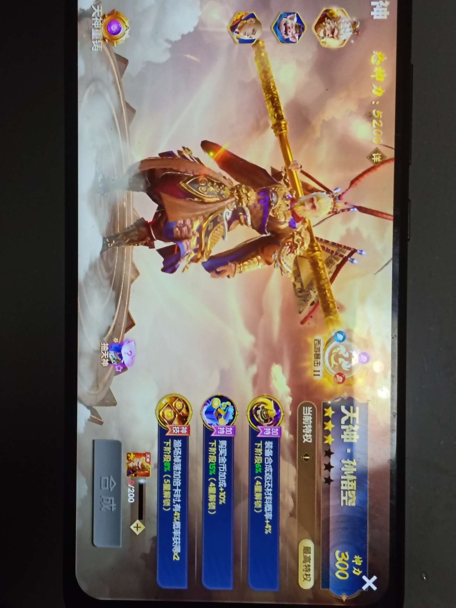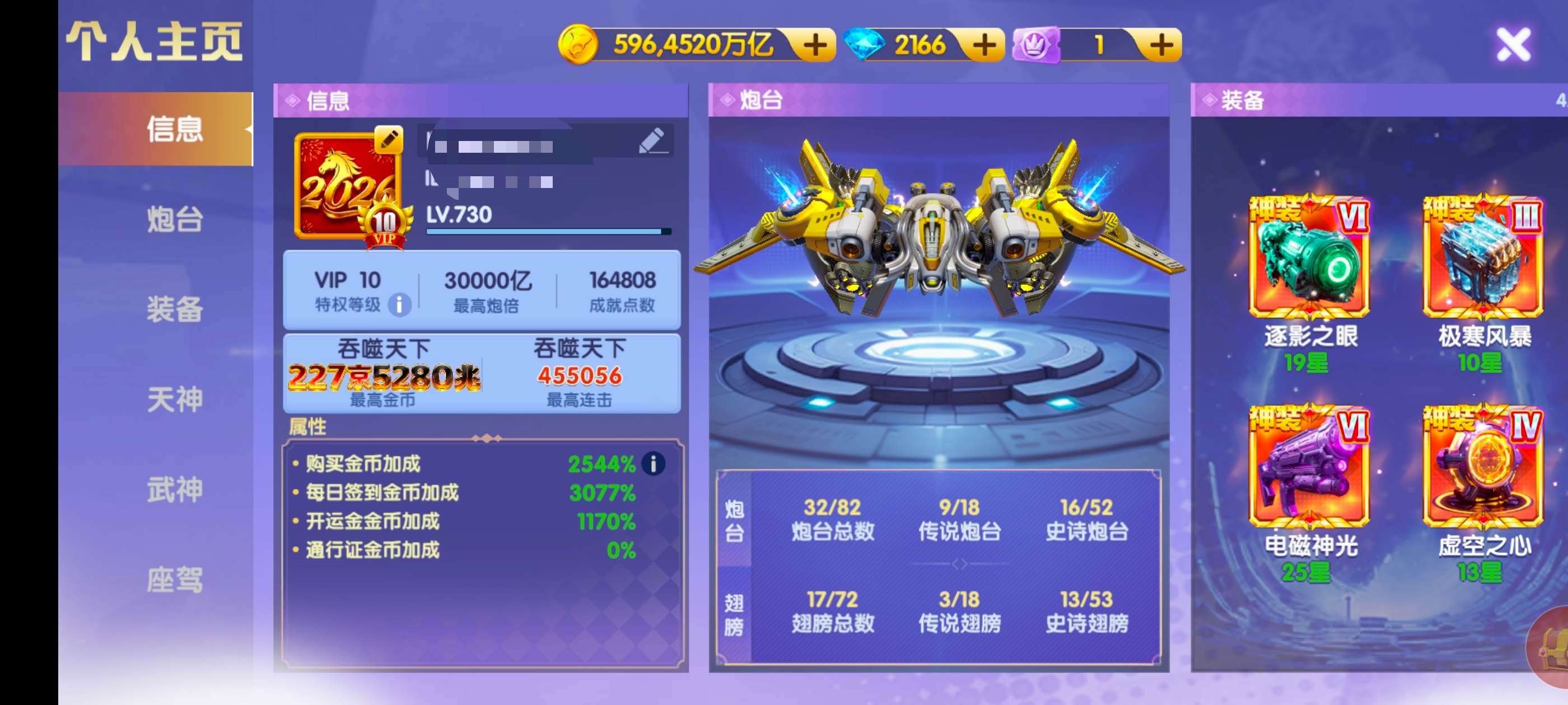 596兆,v10神装3万炮27连击。天神觉醒双龙。洪荒三级西游羁绊。20武神连击2400,7座驾便宜