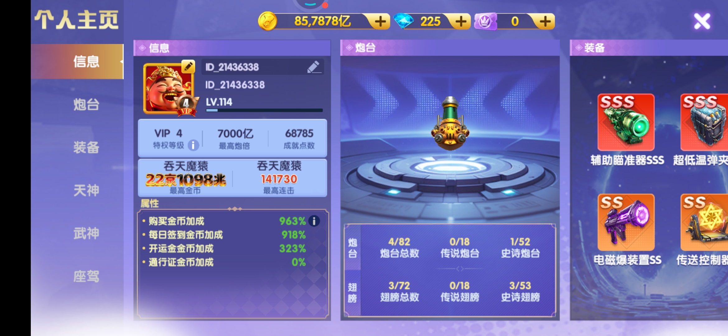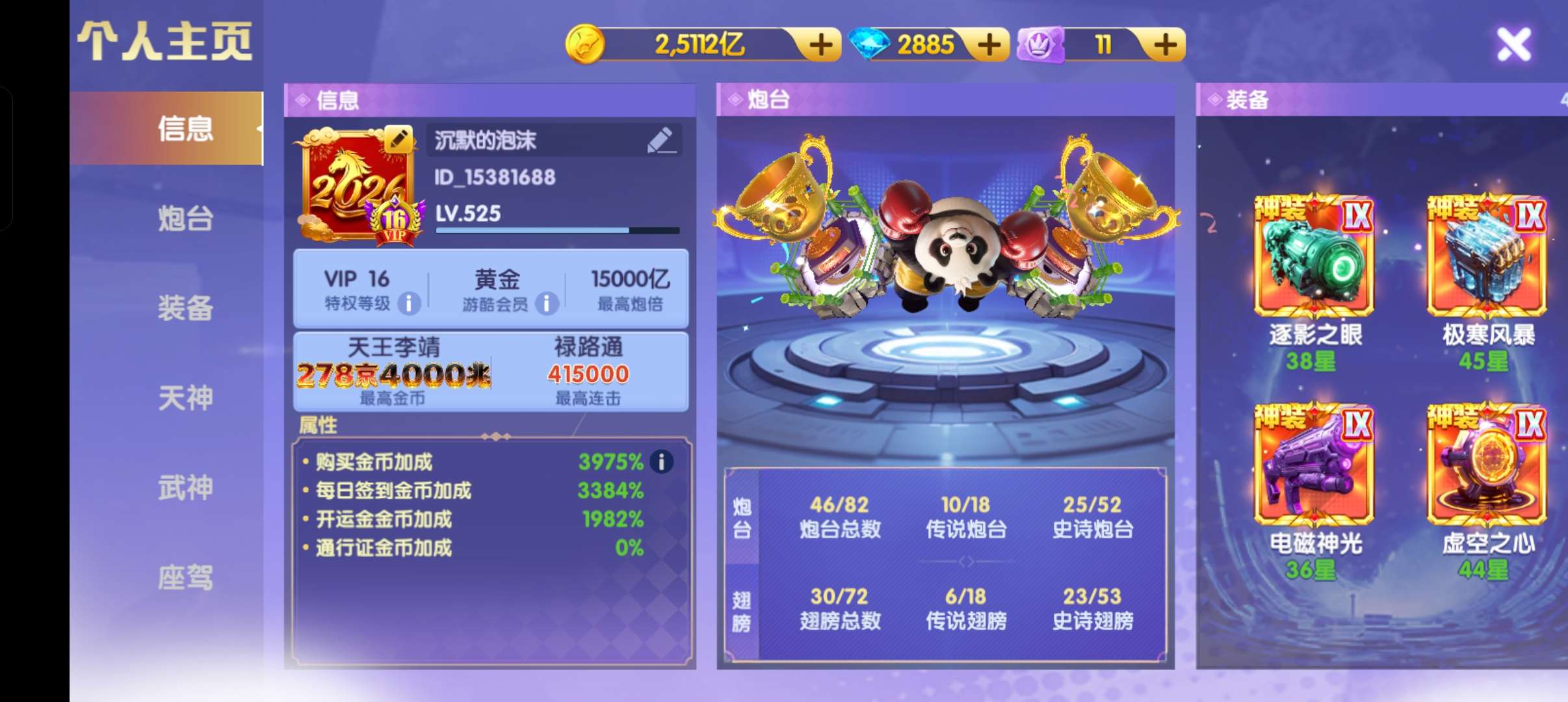 华为系统高爆号,武神三姐妹万炮,天神全觉醒,装备、炮台、天神、武神都很齐,资源多,秒换绑
