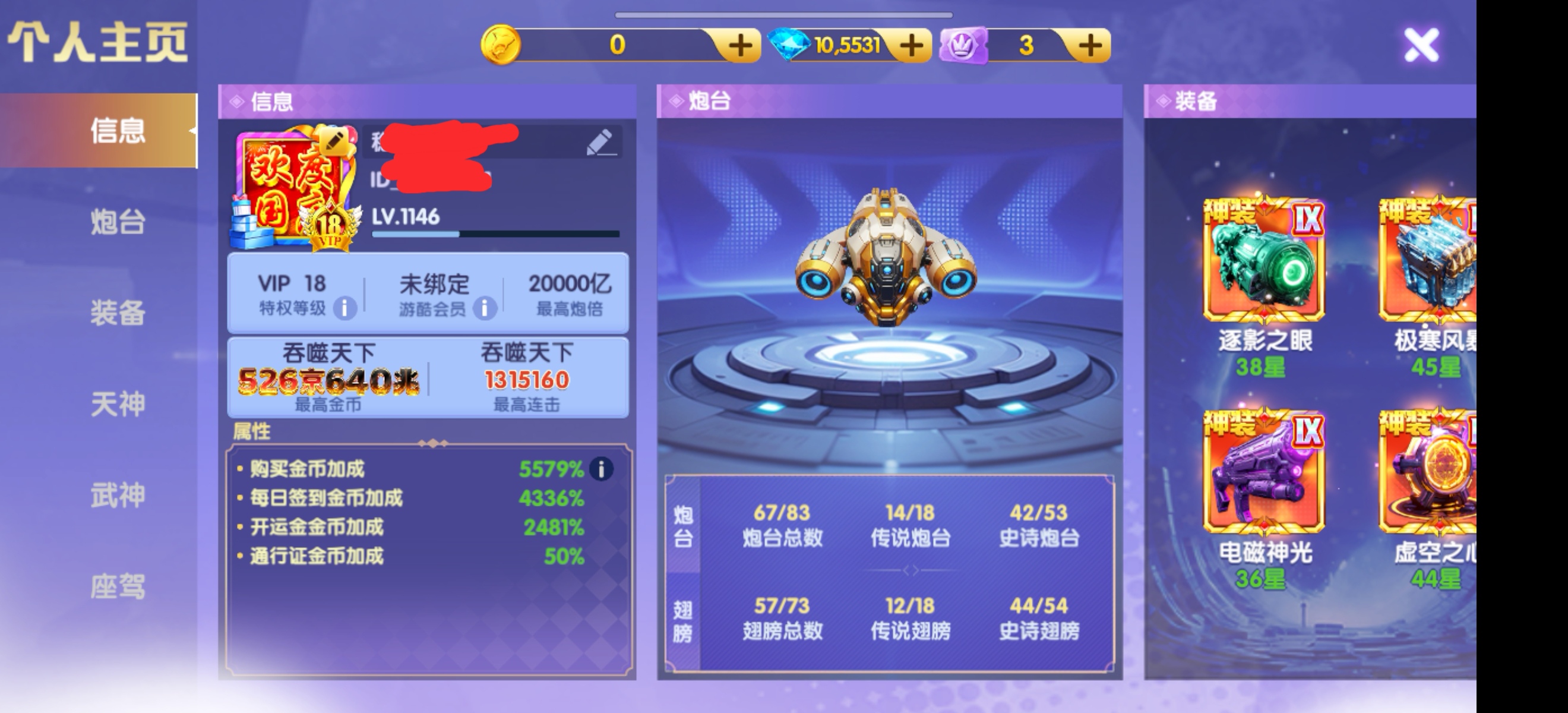 充值2W+VIP15自带五十京金币天神全三级,装备全满级磁炮超神一级,月卡赛季全开武神3600斩击,