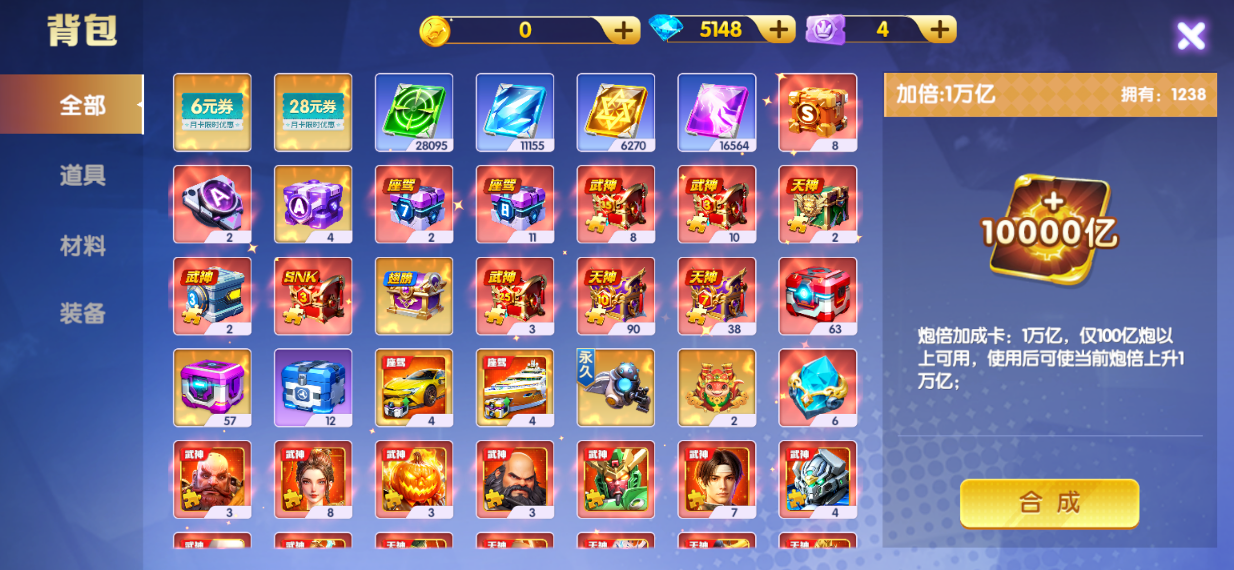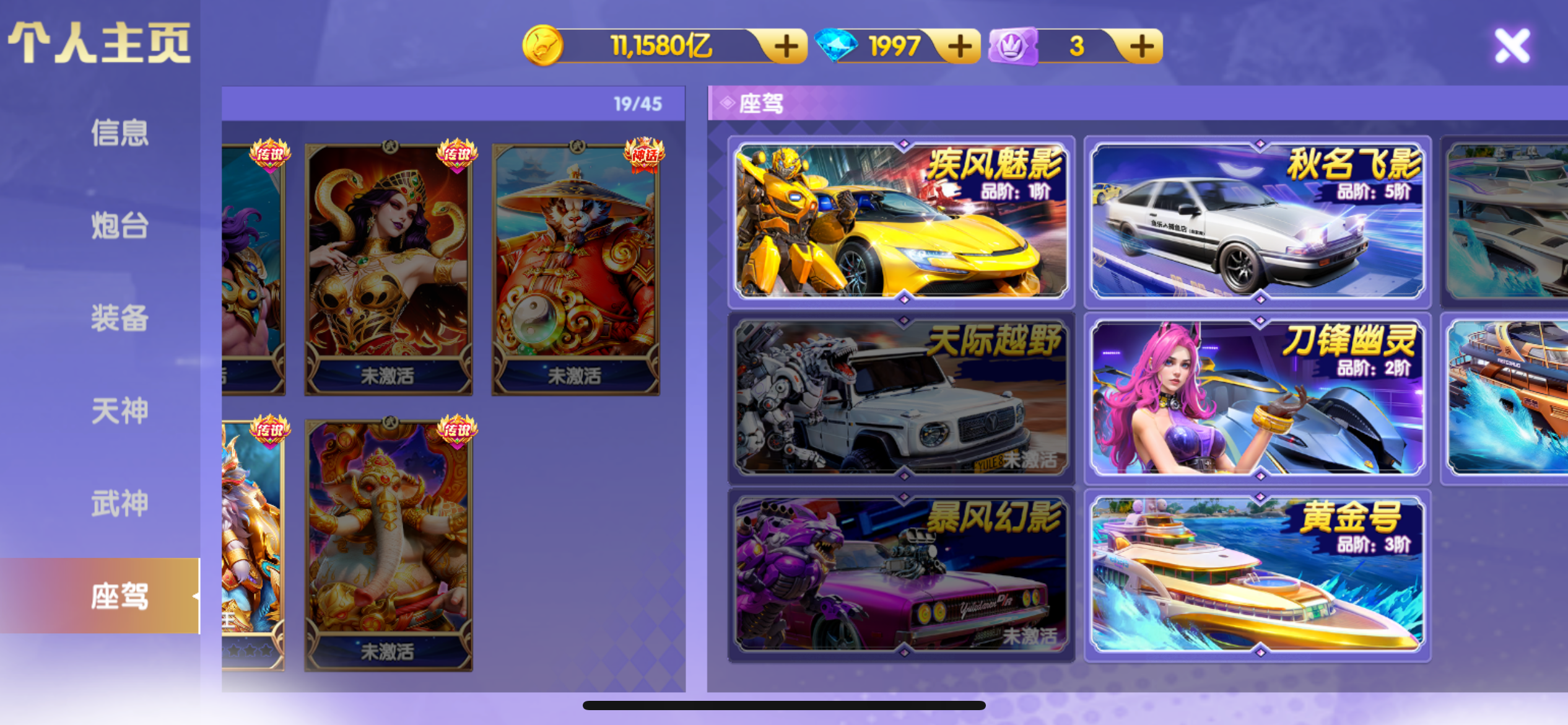 3200京,3万炮神装21连击,天王5星,洪荒限时6级西游羁绊,13武神连击1500。4座驾便宜出