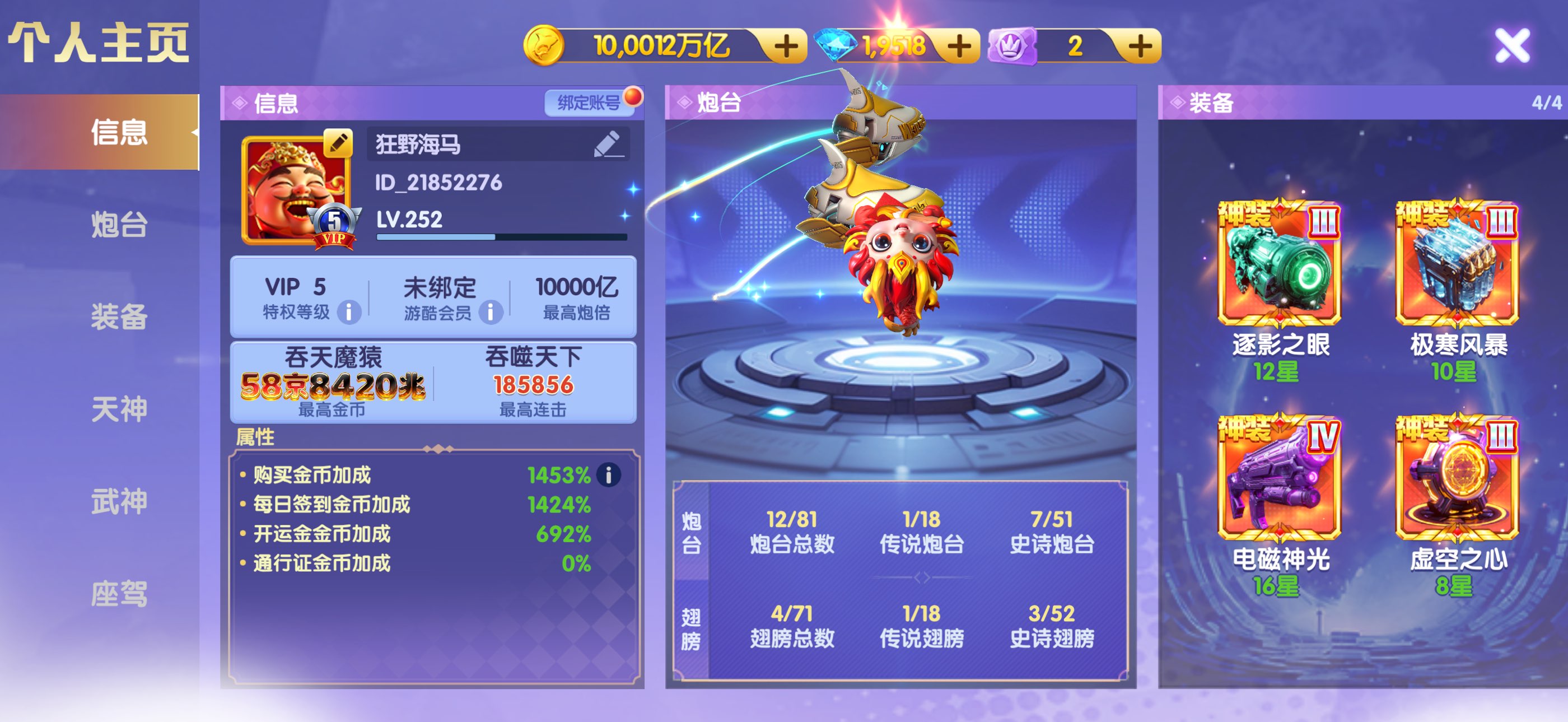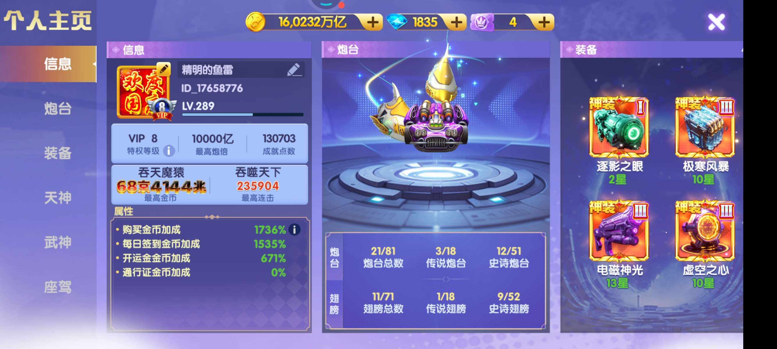 安卓vivo v13 2784加成 1.5万炮倍 11天神 30武神 8座驾
