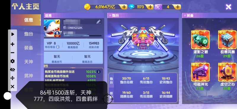 鱼乐达人小米版低价租号25京 神电12星万炮 武神1200连洪荒3级天神全部上班,0.13,0.8