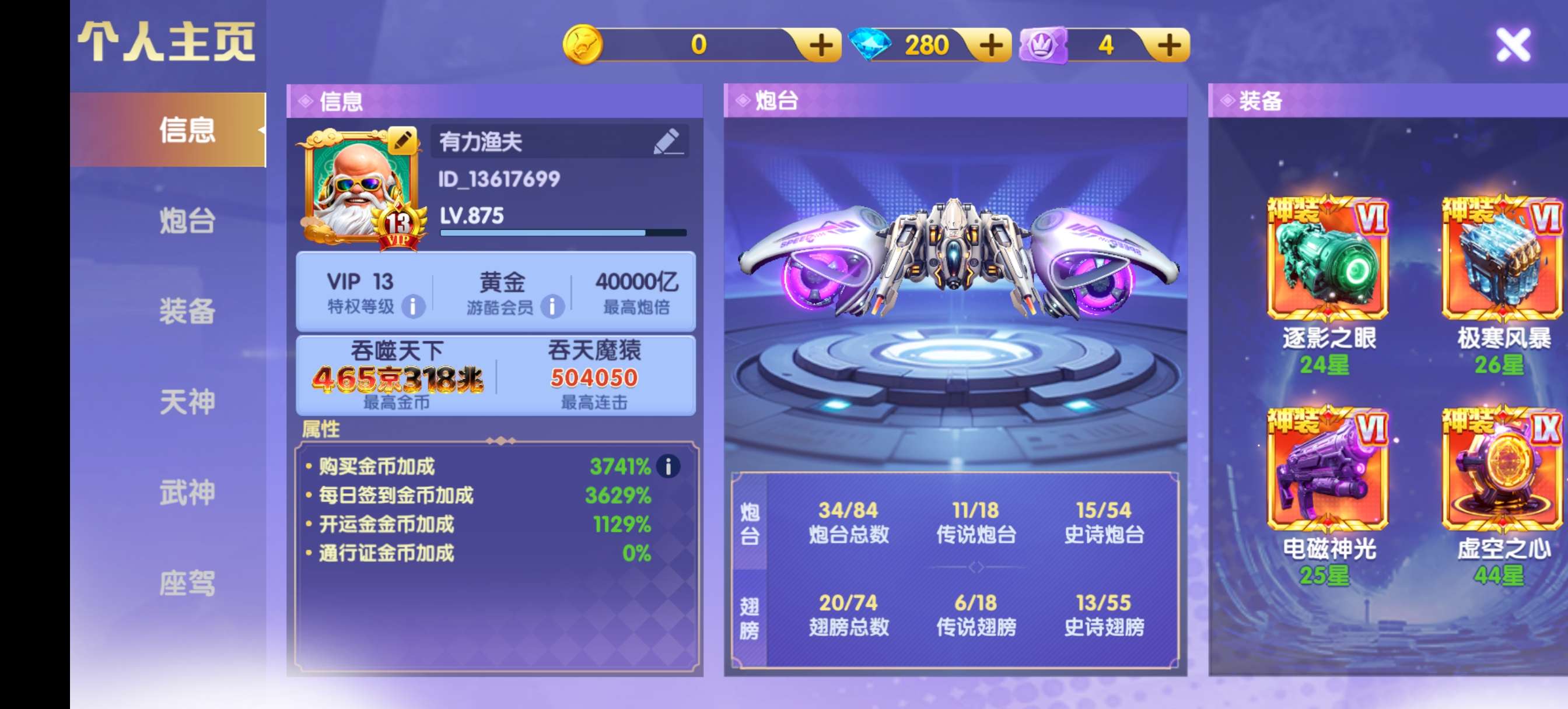 小米v13武神羁绊5套天神觉醒五福上班,3万底炮,2.0洪荒3600连斩。4650加成,秒换绑