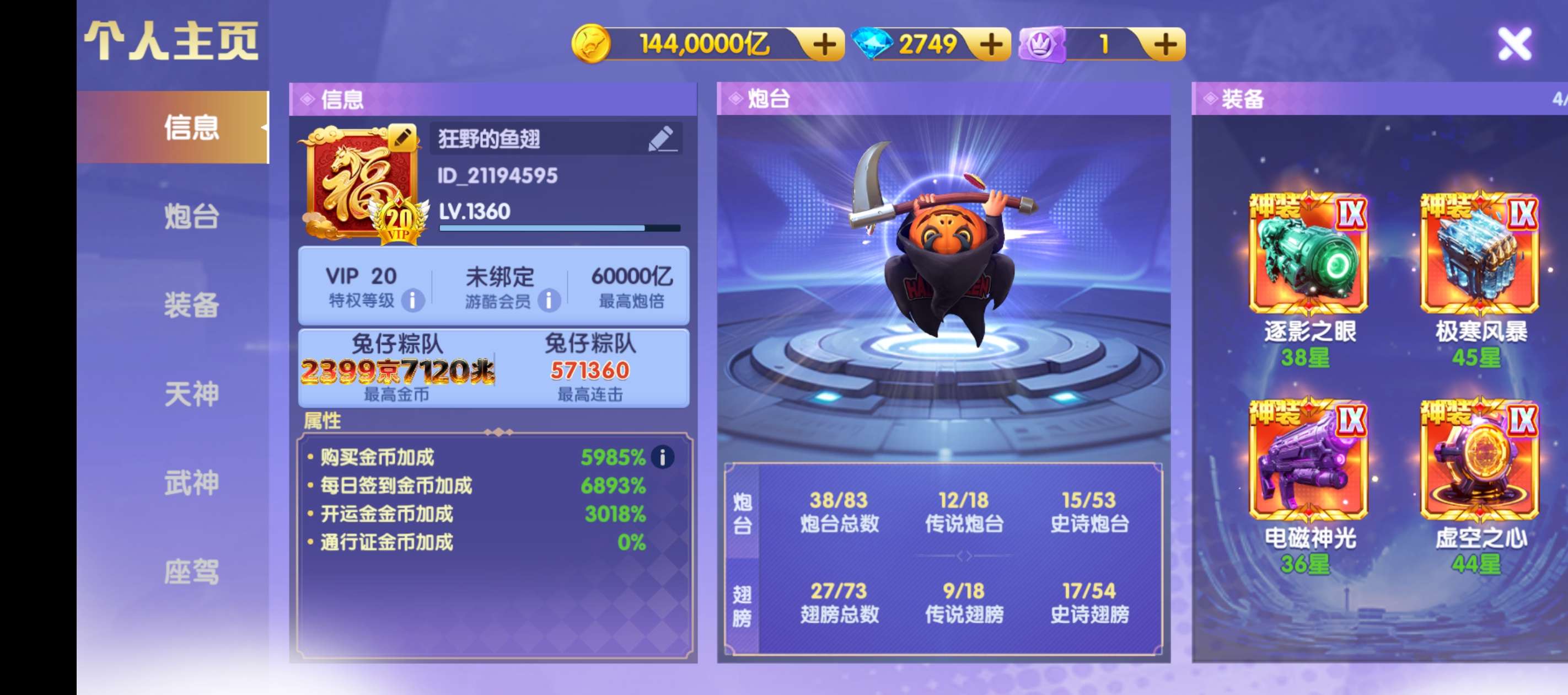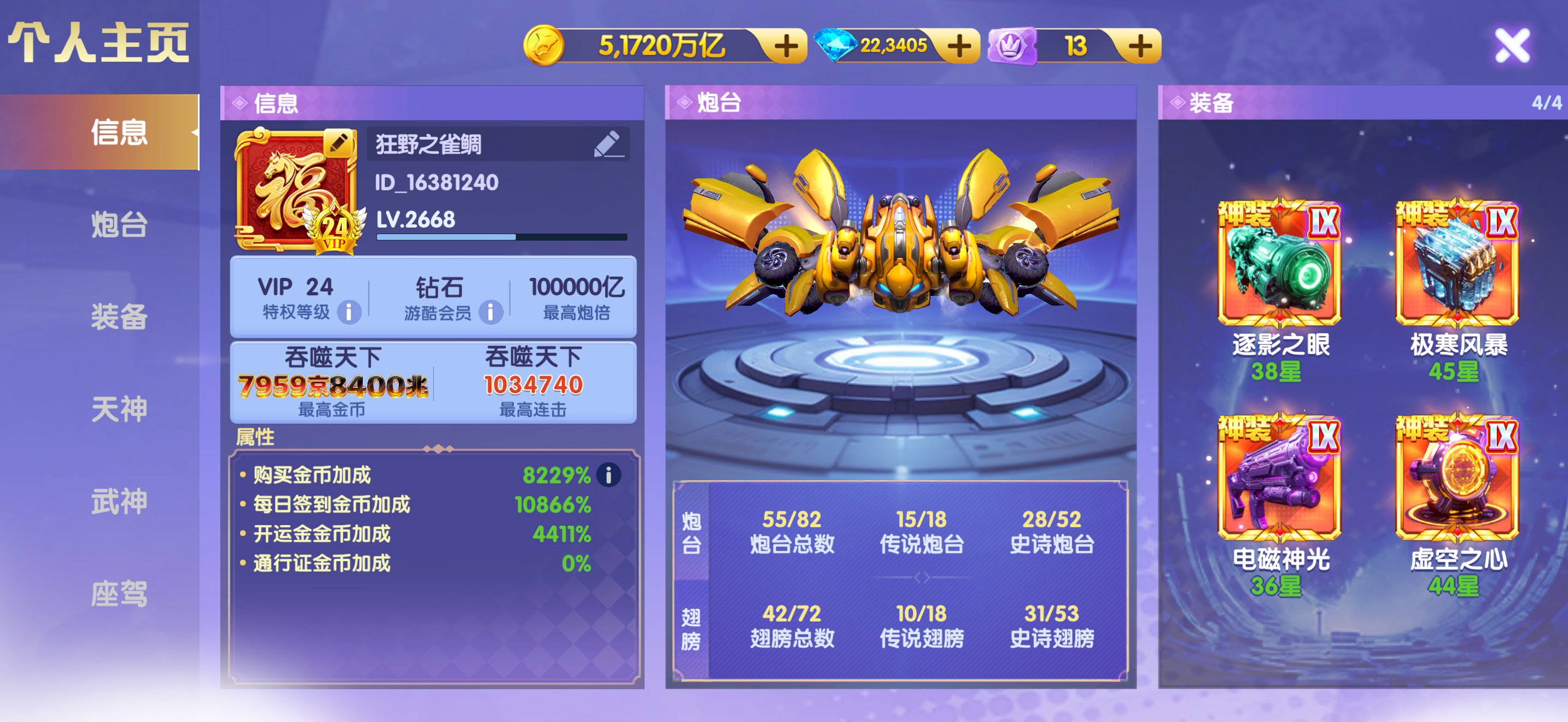 鱼乐达人华自玩账号,67京卖个分钱,全神装,13武神万炮,西游暴击!1200连击,仓库道具齐全!
