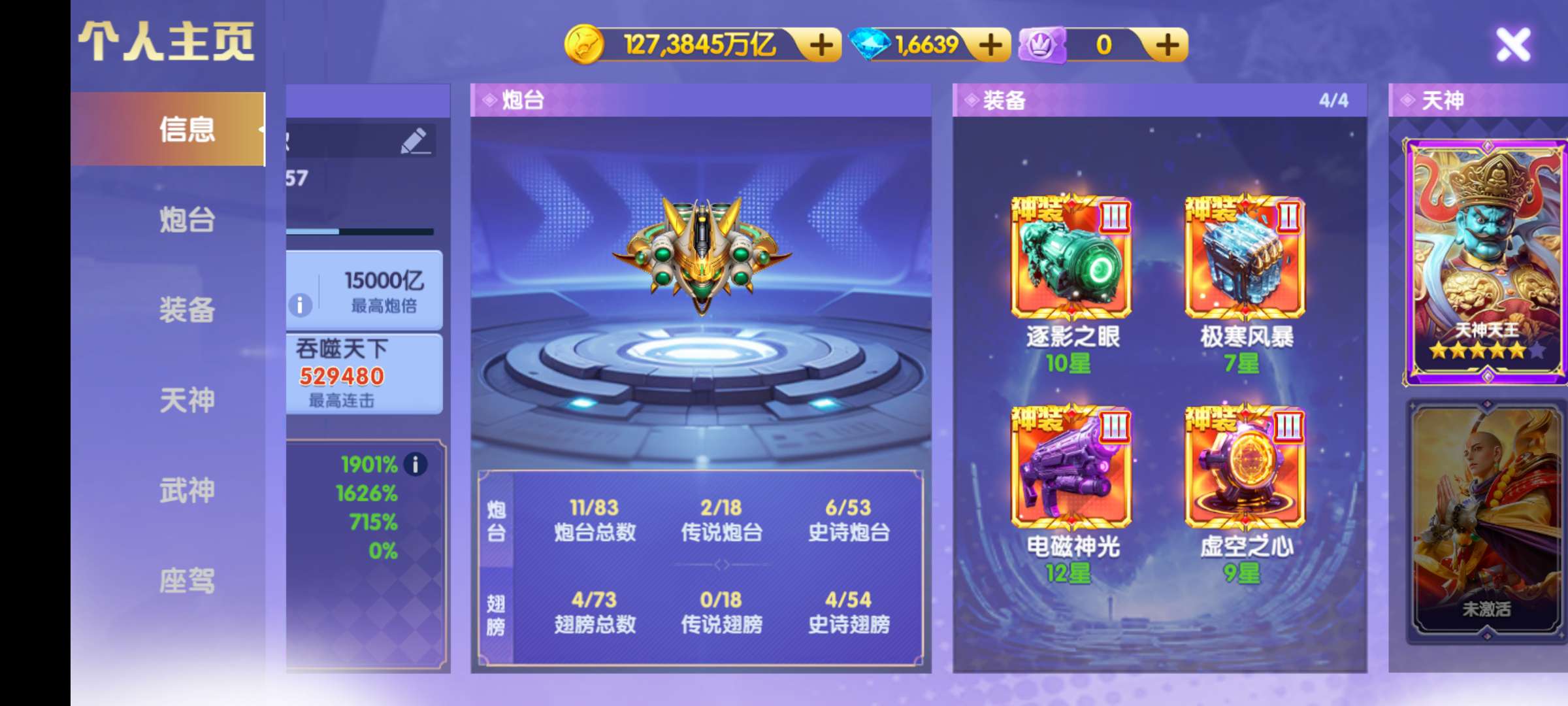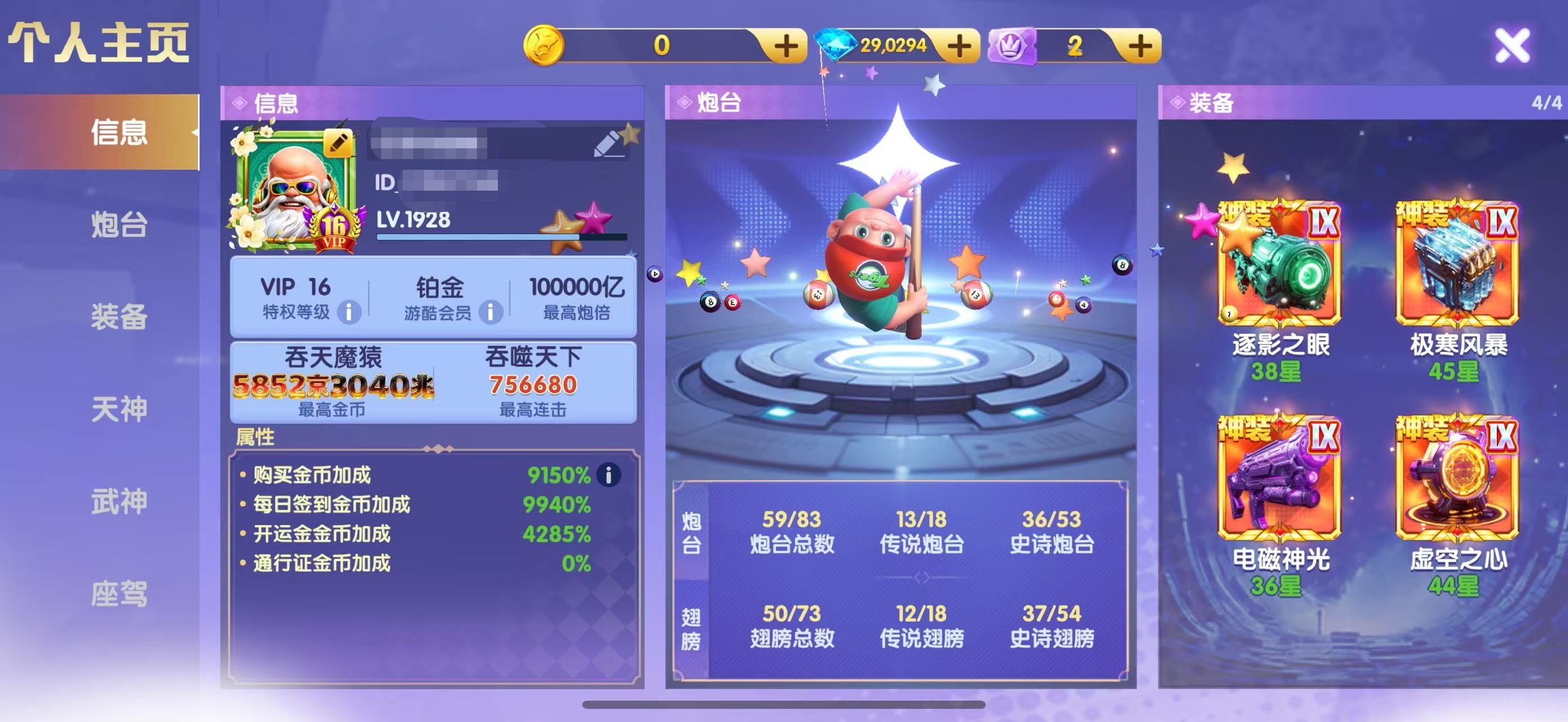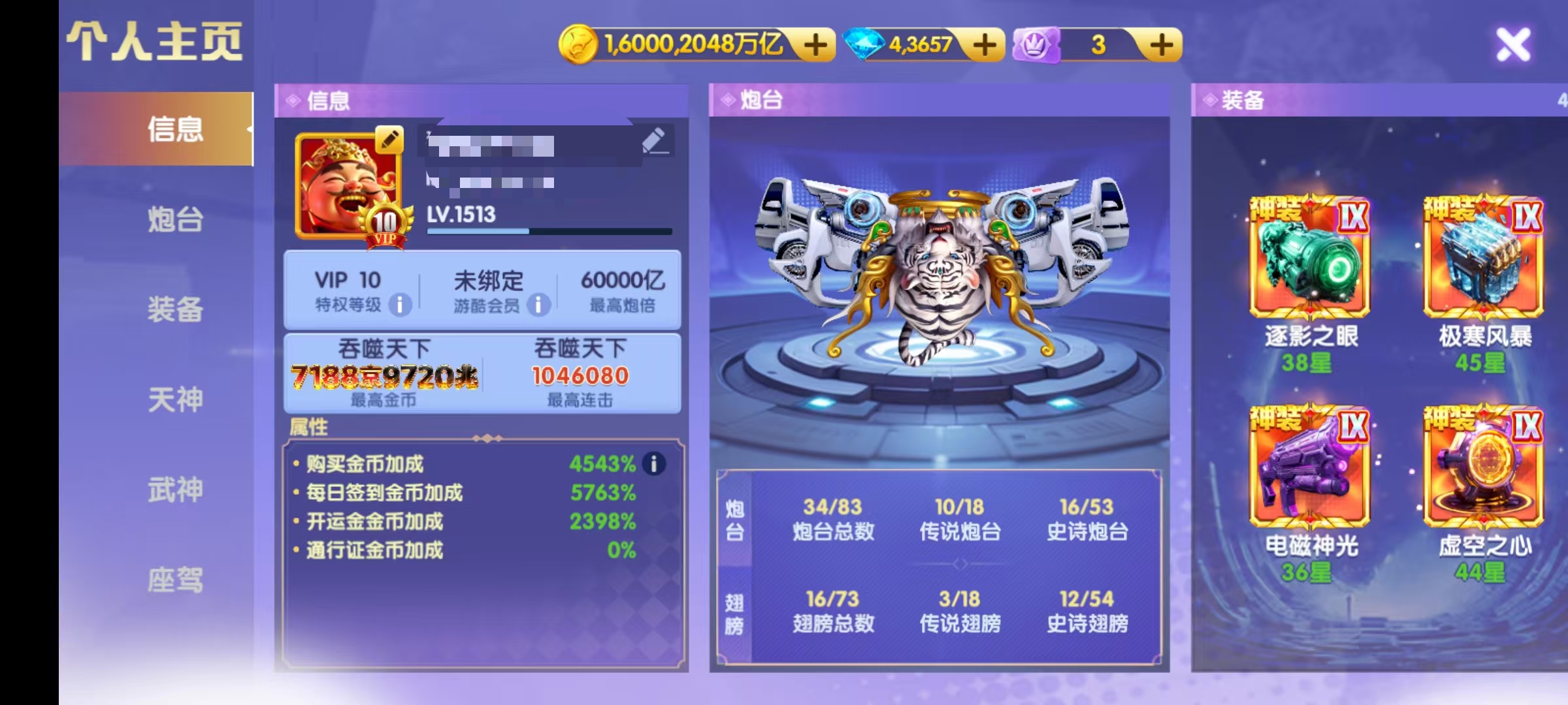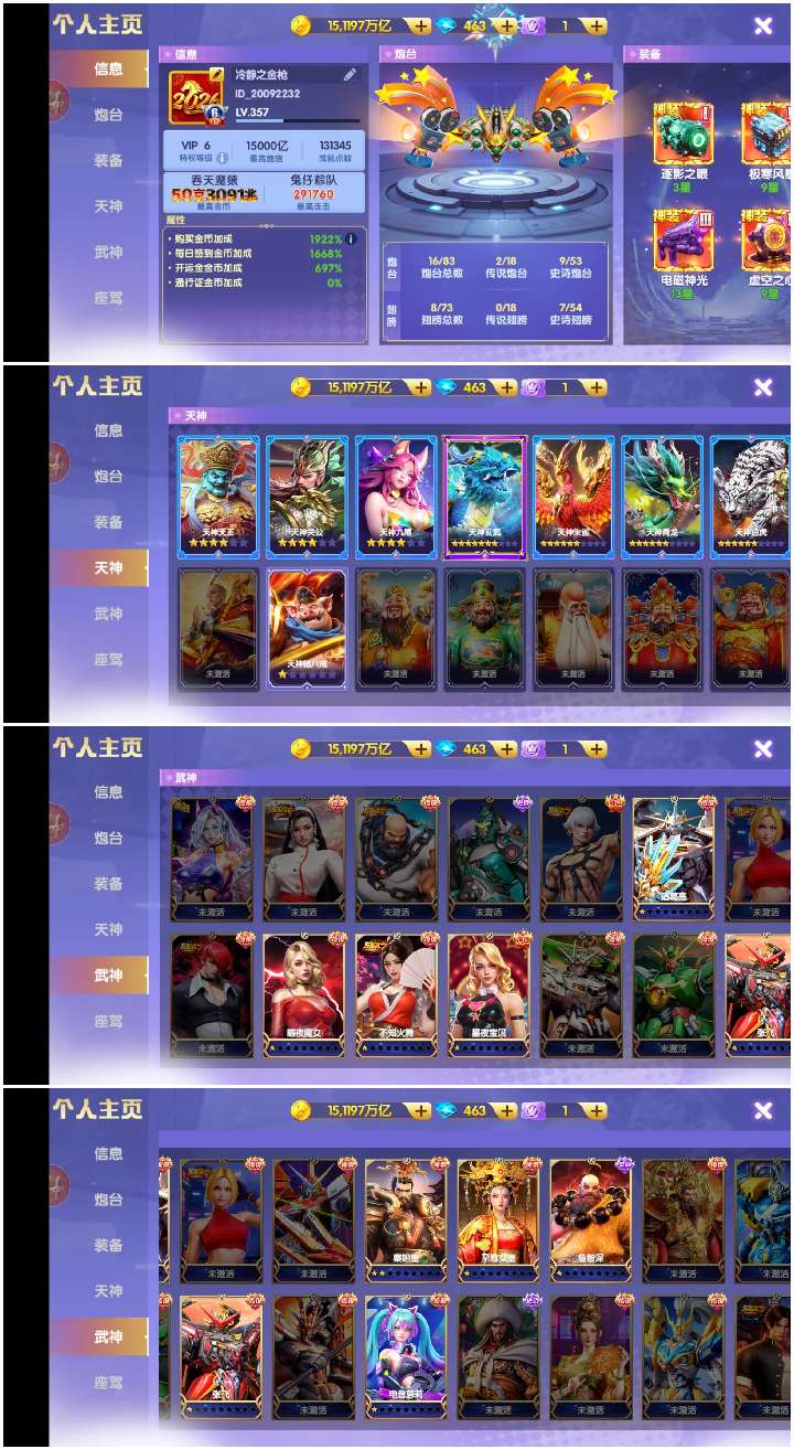 官Q V10 16000京 6万基础炮 天神全觉醒 三姐妹羁绊 2100连斩 超神装3级 资源多多