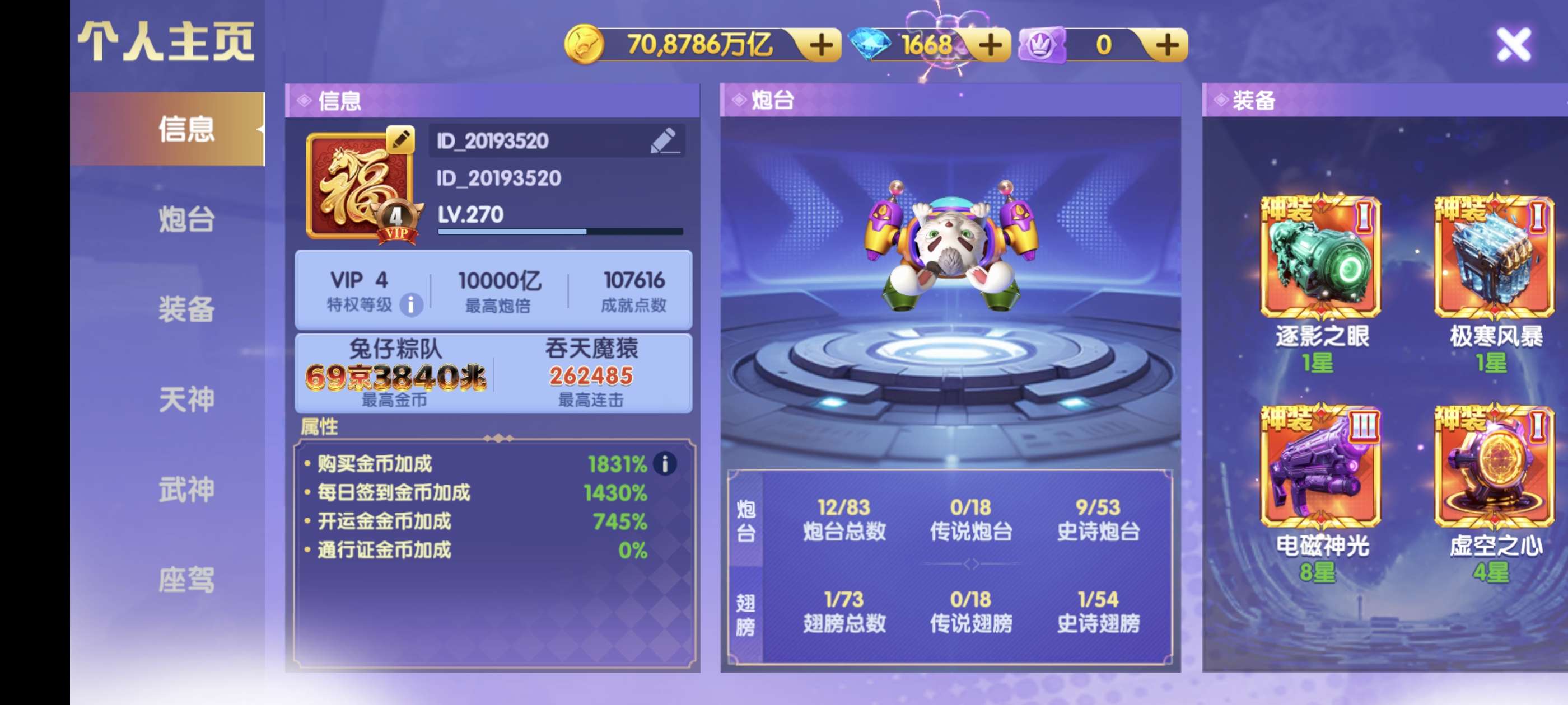 901兆,2万炮神装21连击。天王觉醒。洪荒限时5级。西游羁绊。10雾神连击1200便宜出2万炸弹送