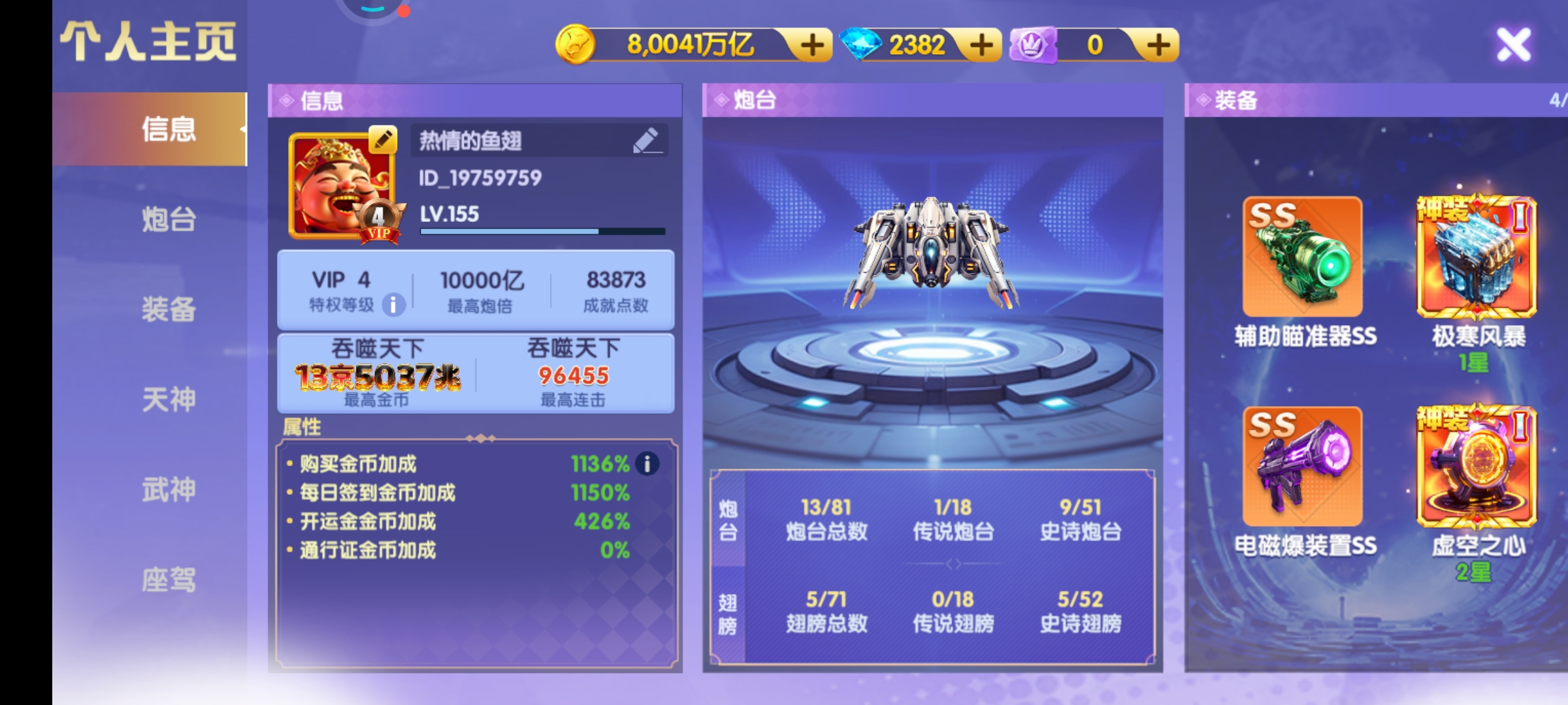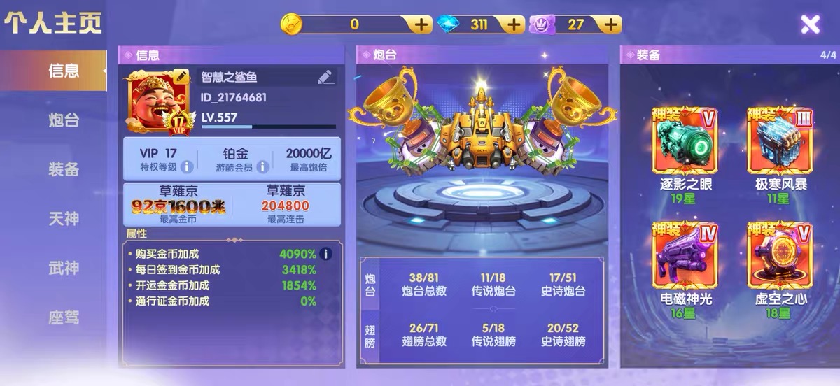 安卓vivo v13 2784加成 1.5万炮倍 11天神 30武神 8座驾