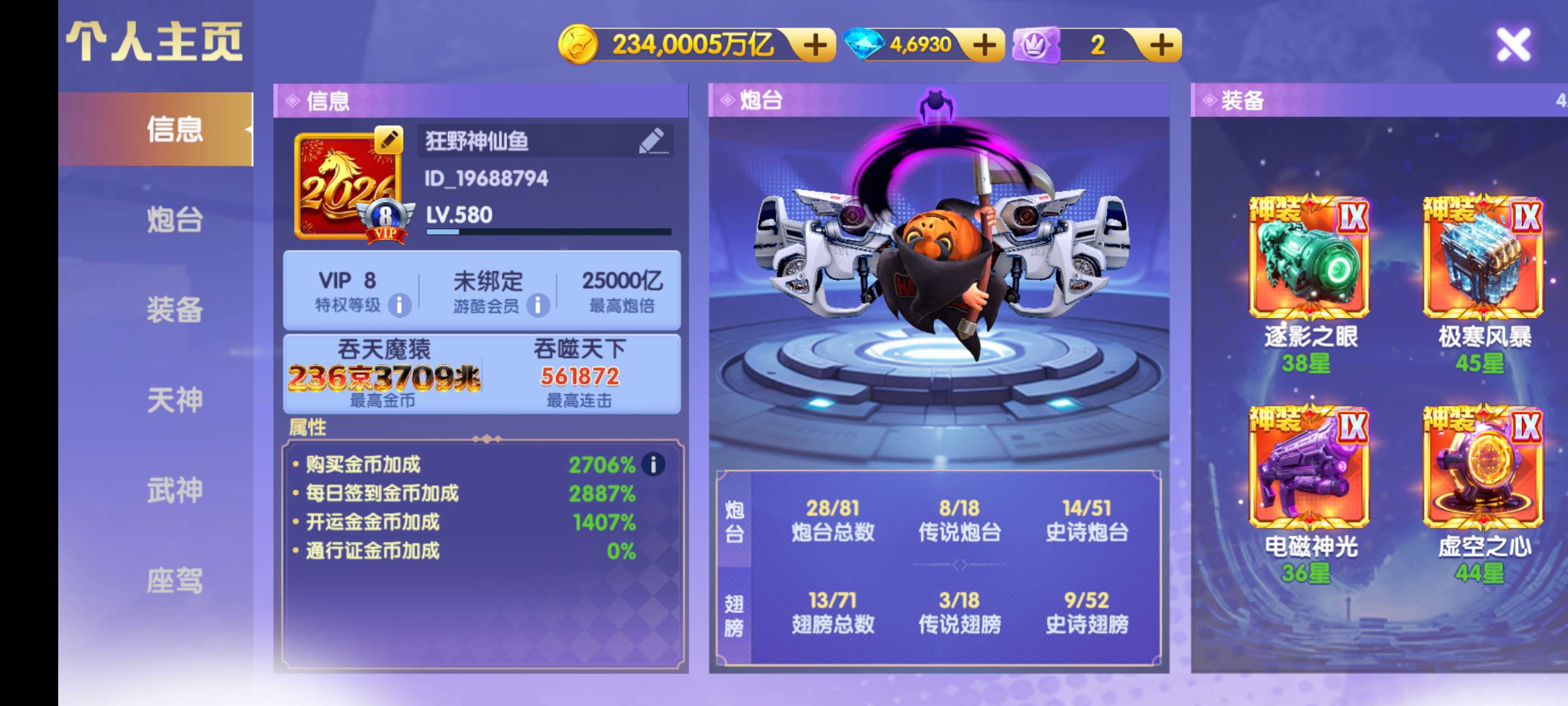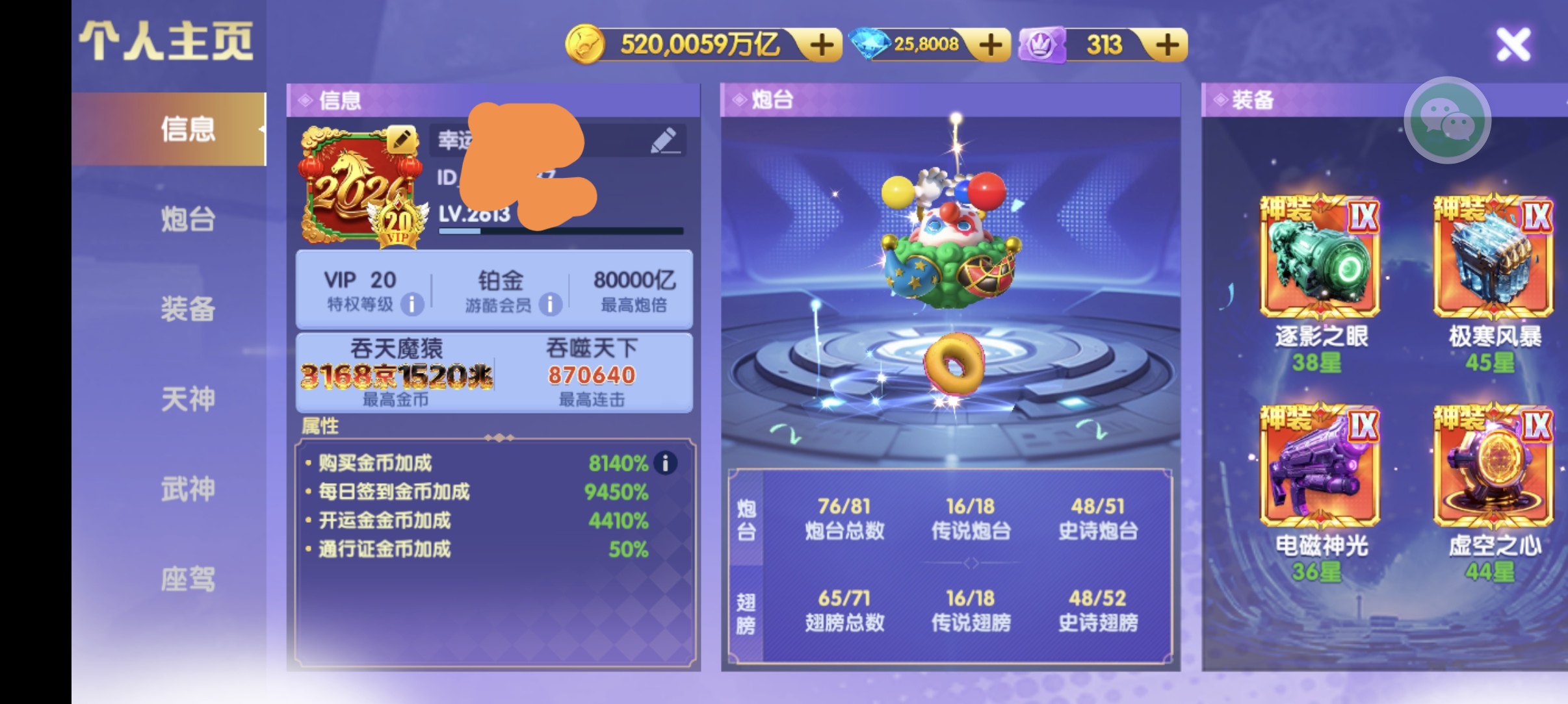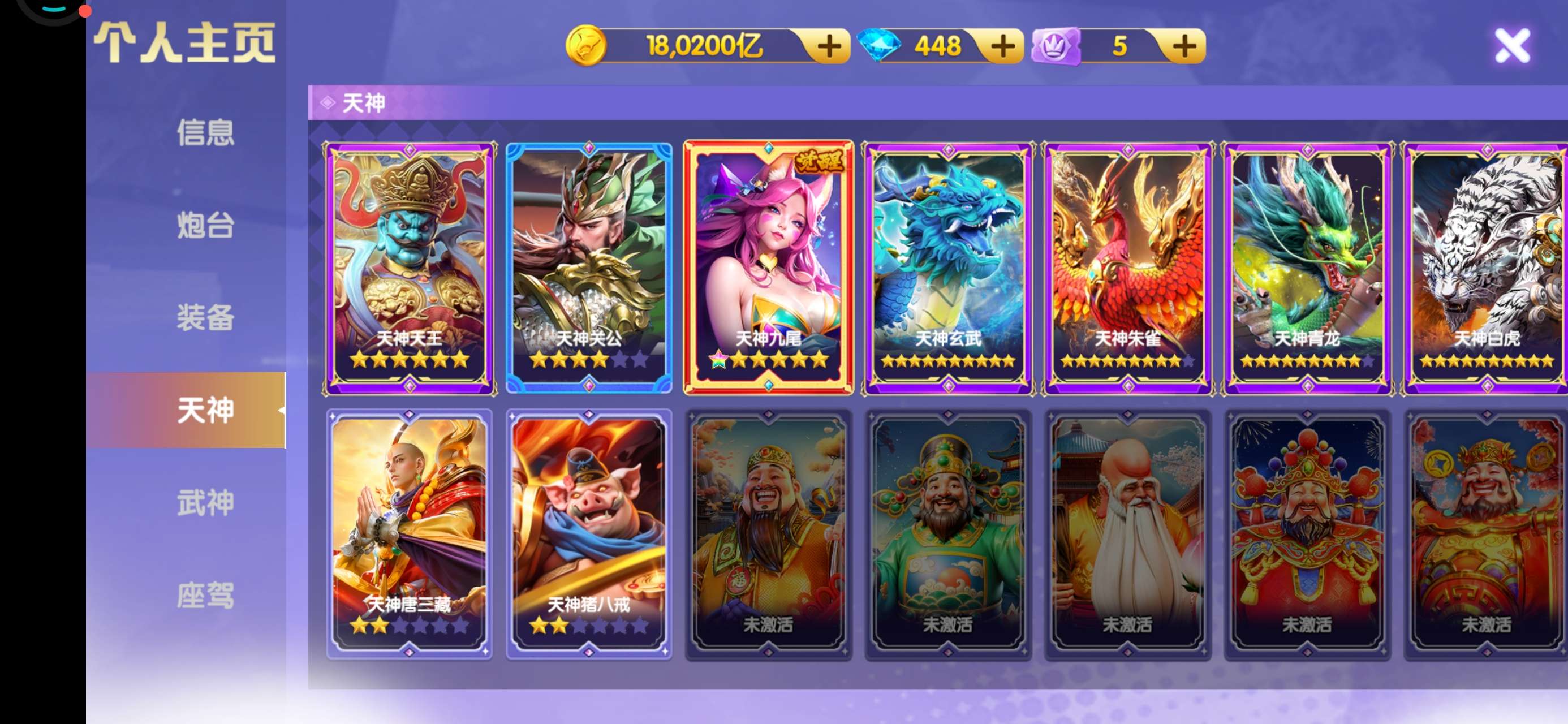 V8天花板,基础4万炮,1300多京,满神装,满天神,武神羁绊都有。自己看。破回