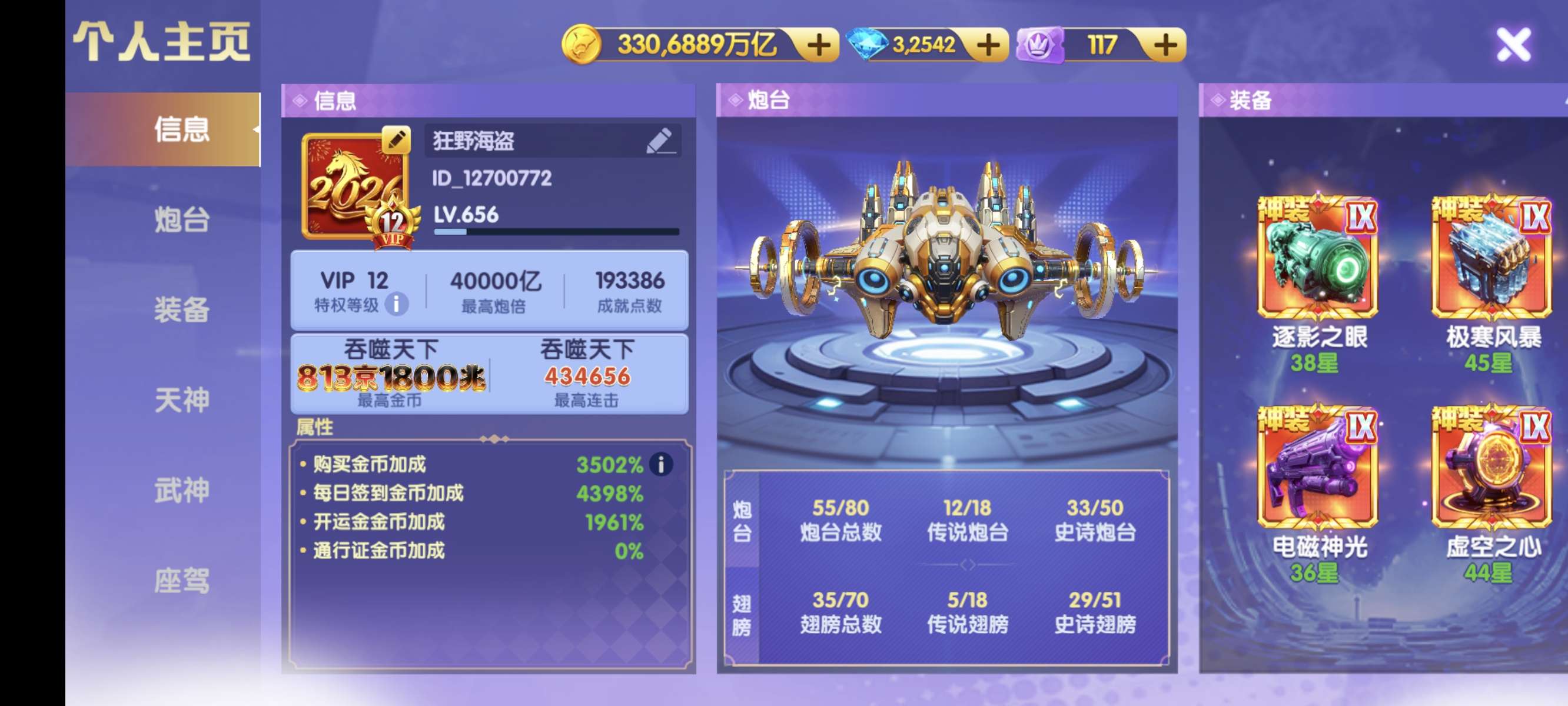 v25 6800加成 50000炮 天神基本都满 3个返点券翅膀 可换绑