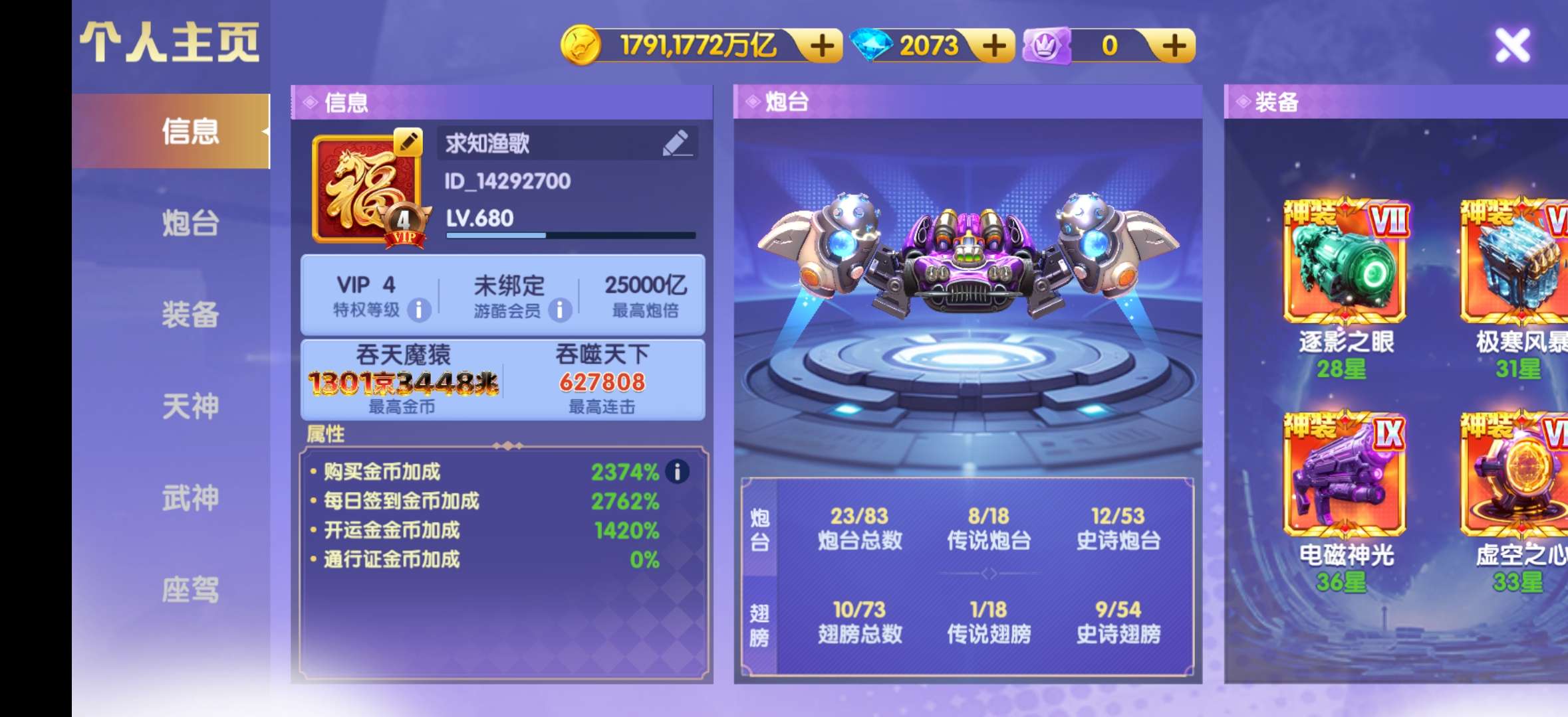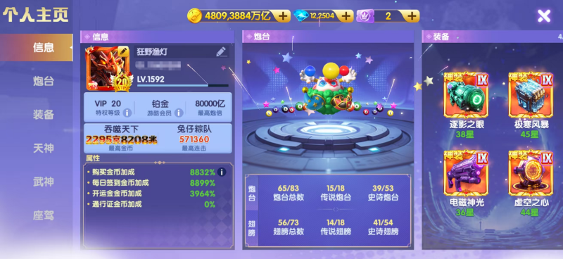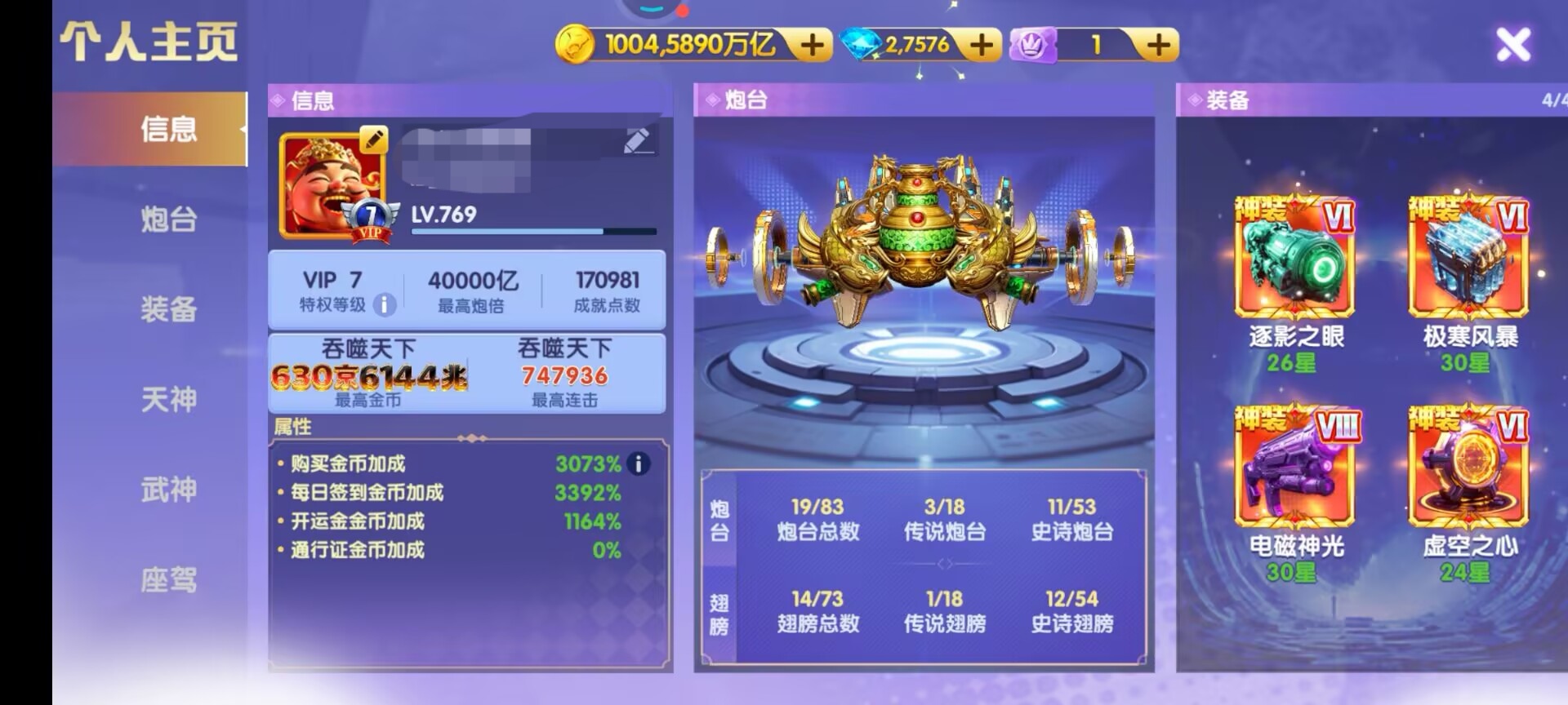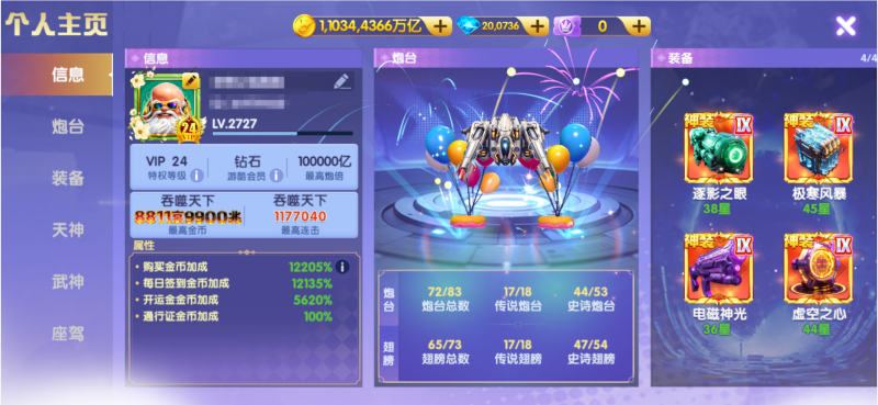 小米版买断号,1760京,3万炮,电磁神装25星,觉醒,黑炮10万,限时洪荒x3,三姐妹羁绊,武神2