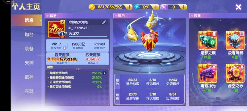 小米版买断号,881京,1.5万炮,电磁神装25星,三觉醒,黑炮5万,限时洪荒x3,三姐妹羁绊