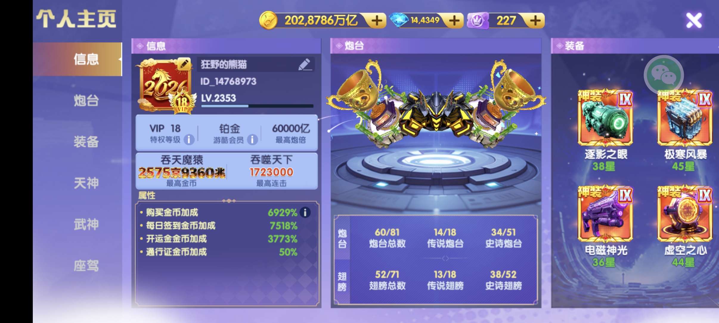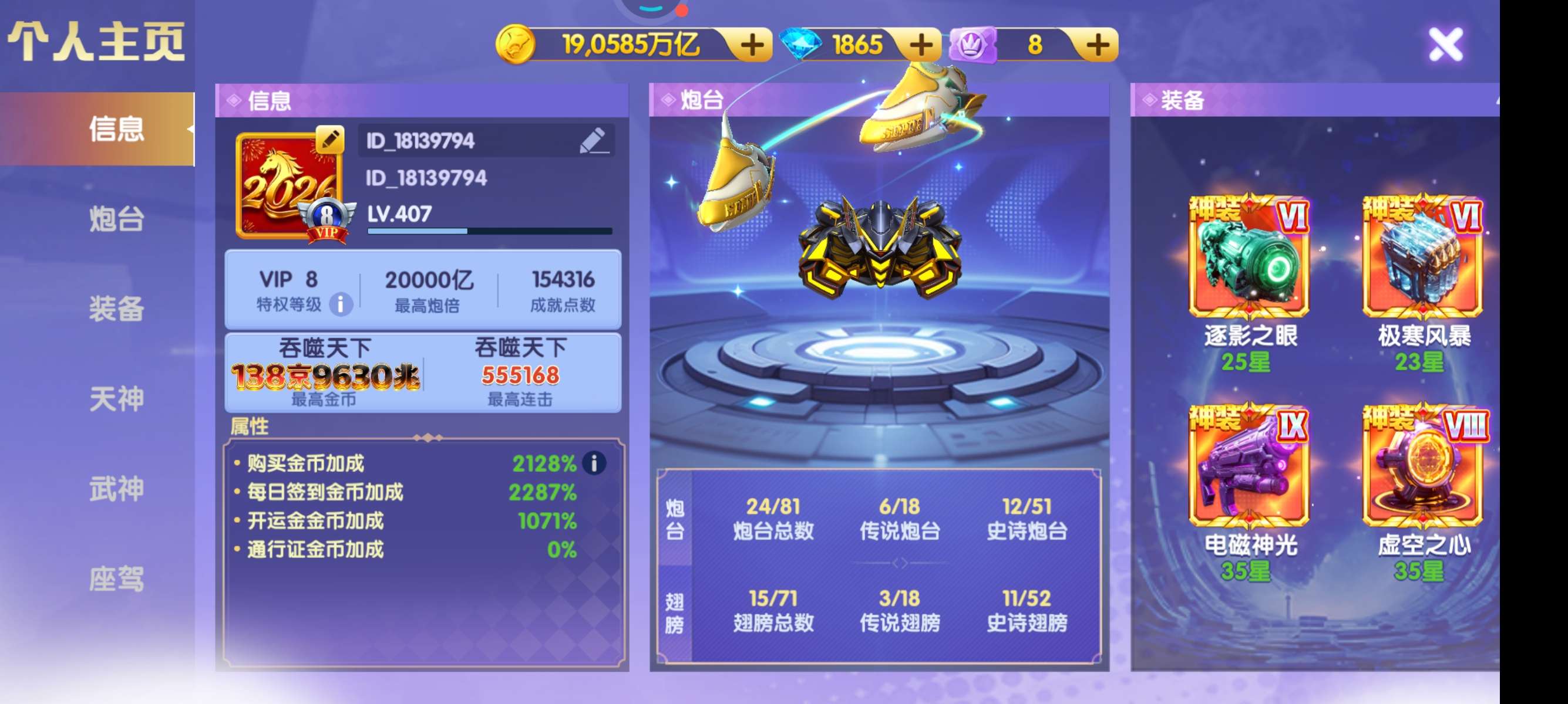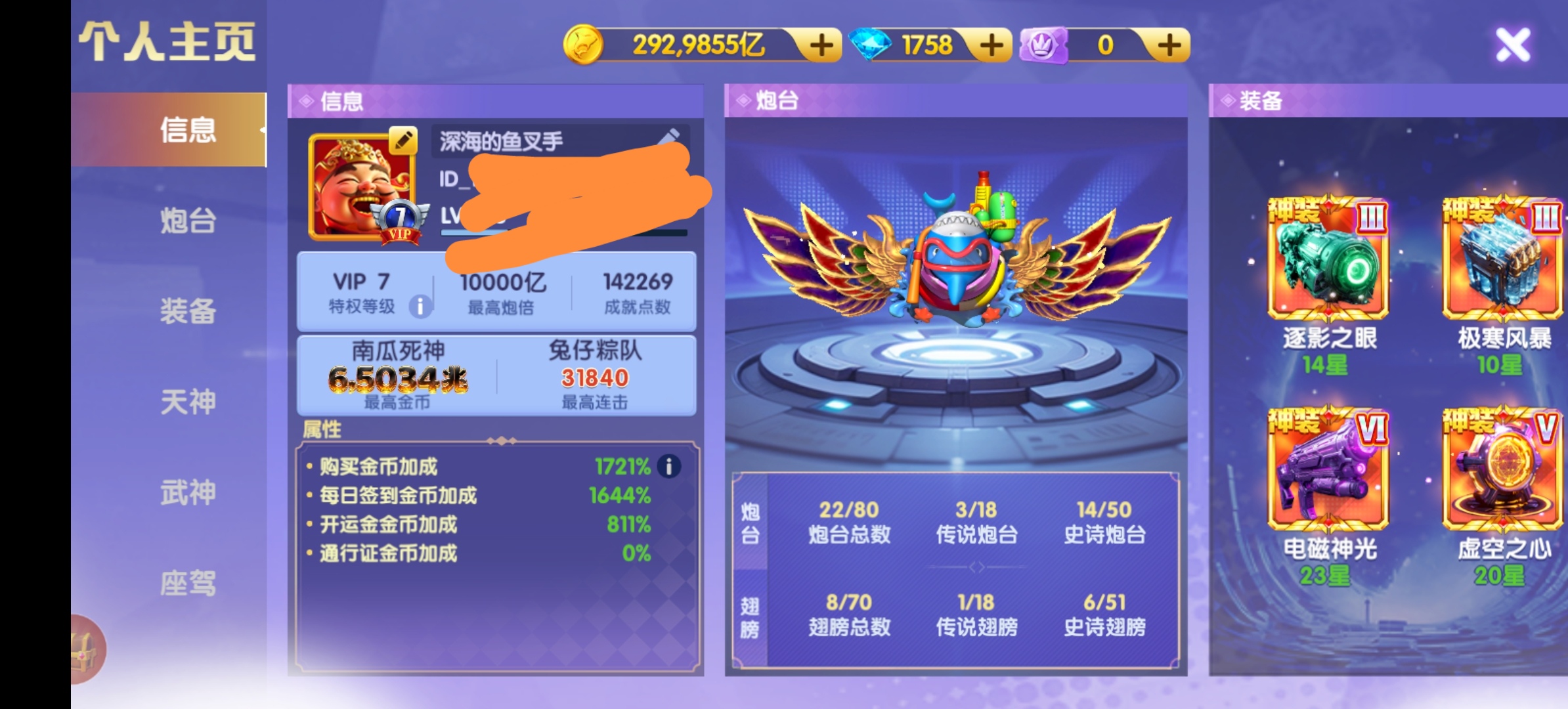 v25 6800加成 50000炮 天神基本都满 3个返点券翅膀 可换绑