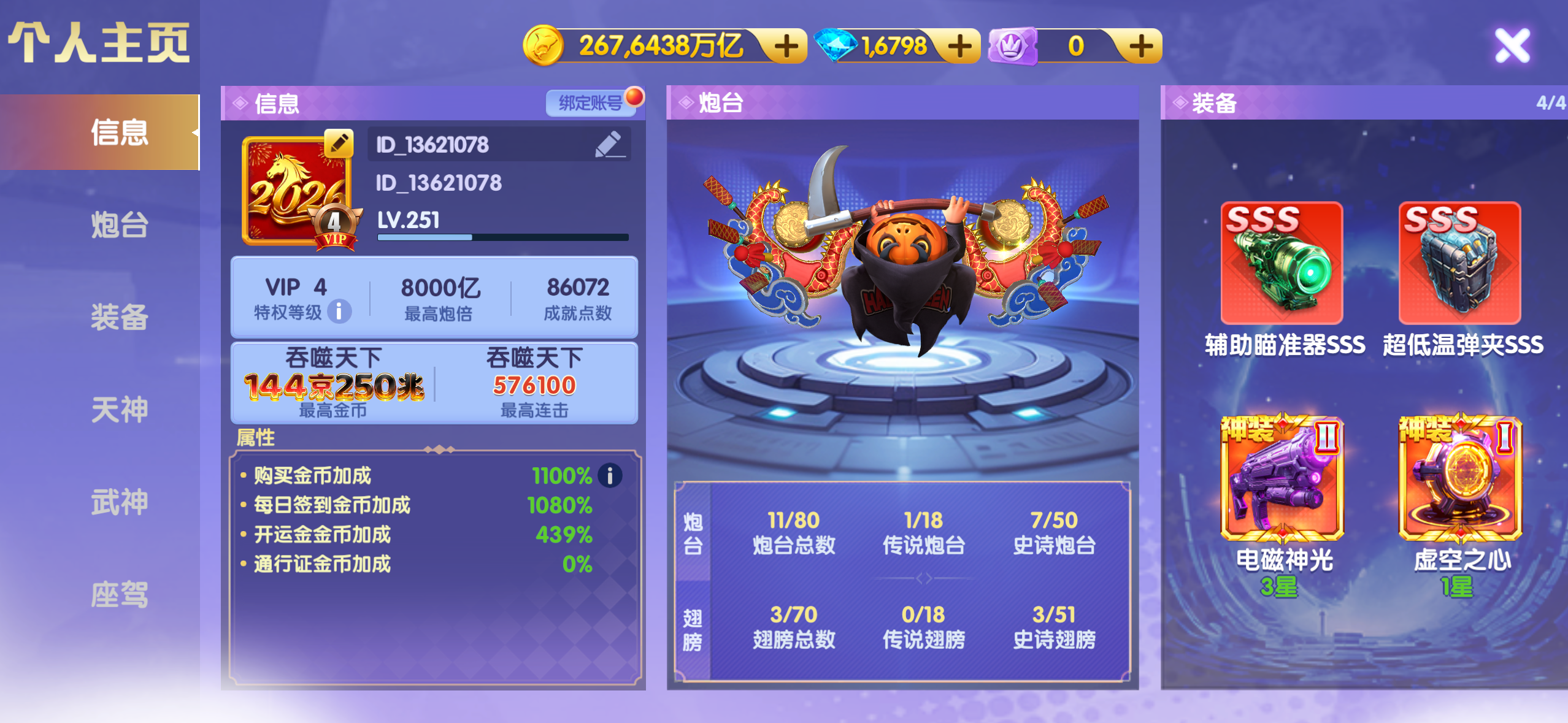 V14-2193加成-10000亿炮-神装套-天神两觉醒-座驾缺黑金号-手机账号 一手号可换绑