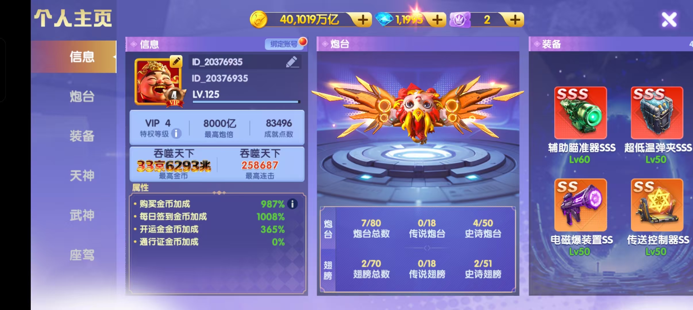 133兆。v7万五炮台。天王6星双龙。洪荒三级西游羁绊,12武神连击1500便宜出