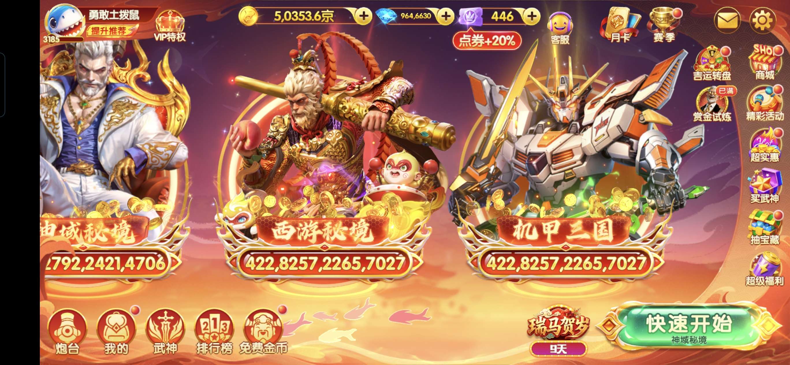 官服(手机登陆/包安全)-V19-6068加成-超神2套-10彩天神带五福-武神都不差,爆率高,带3W+钻石和5500+盲盒币,还有4W+混元珠,炮弹还可以炸