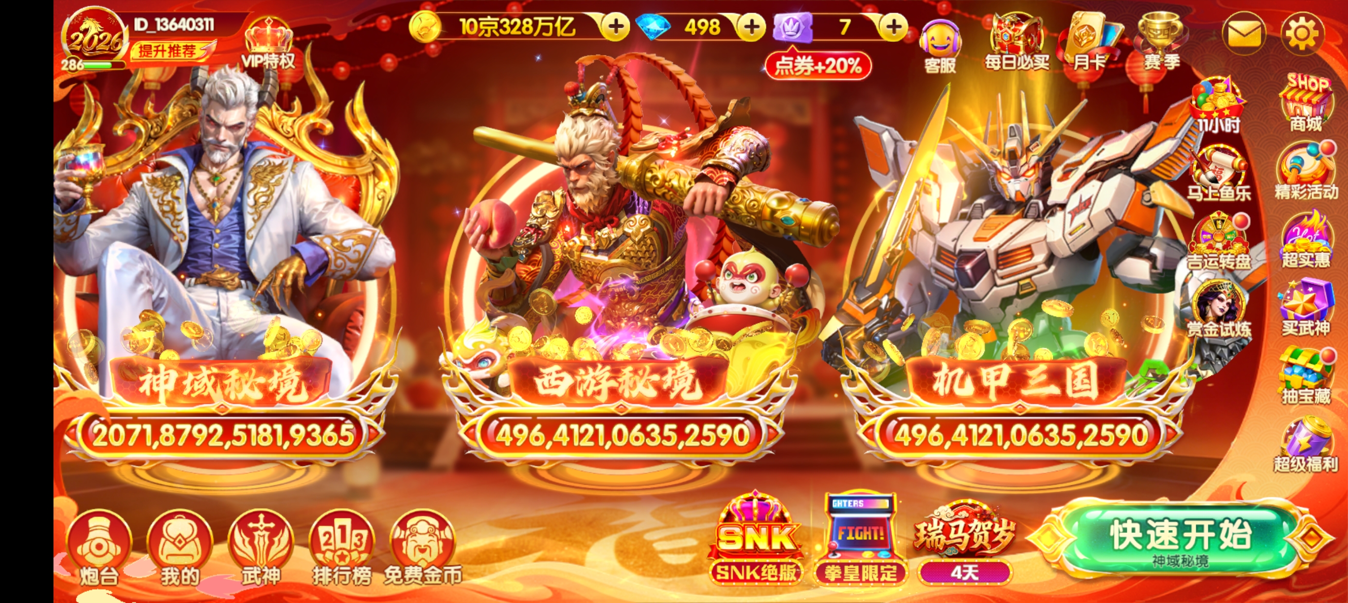 出V12官方号10京金币,洪荒3,900连击,多武神天神翻倍