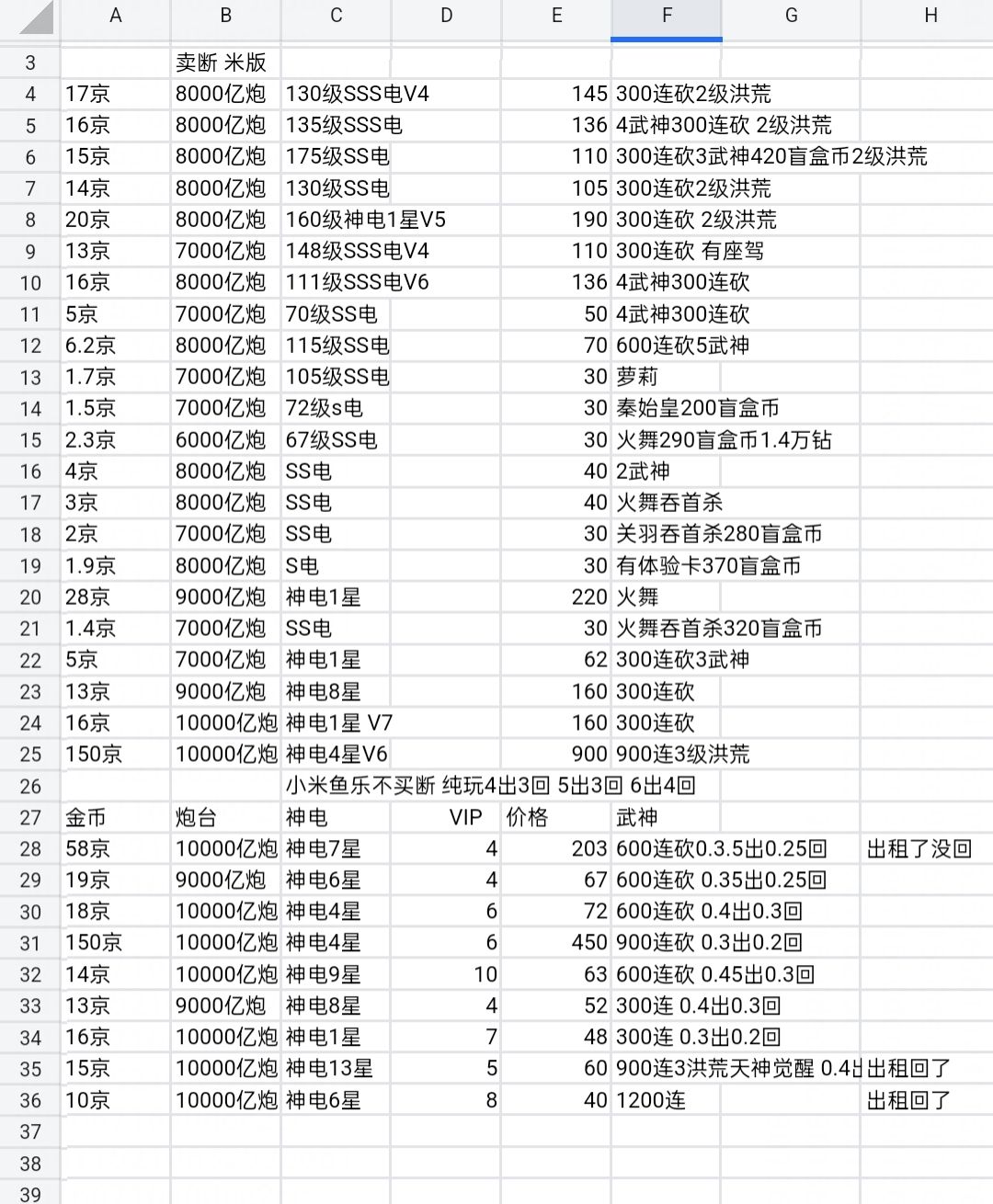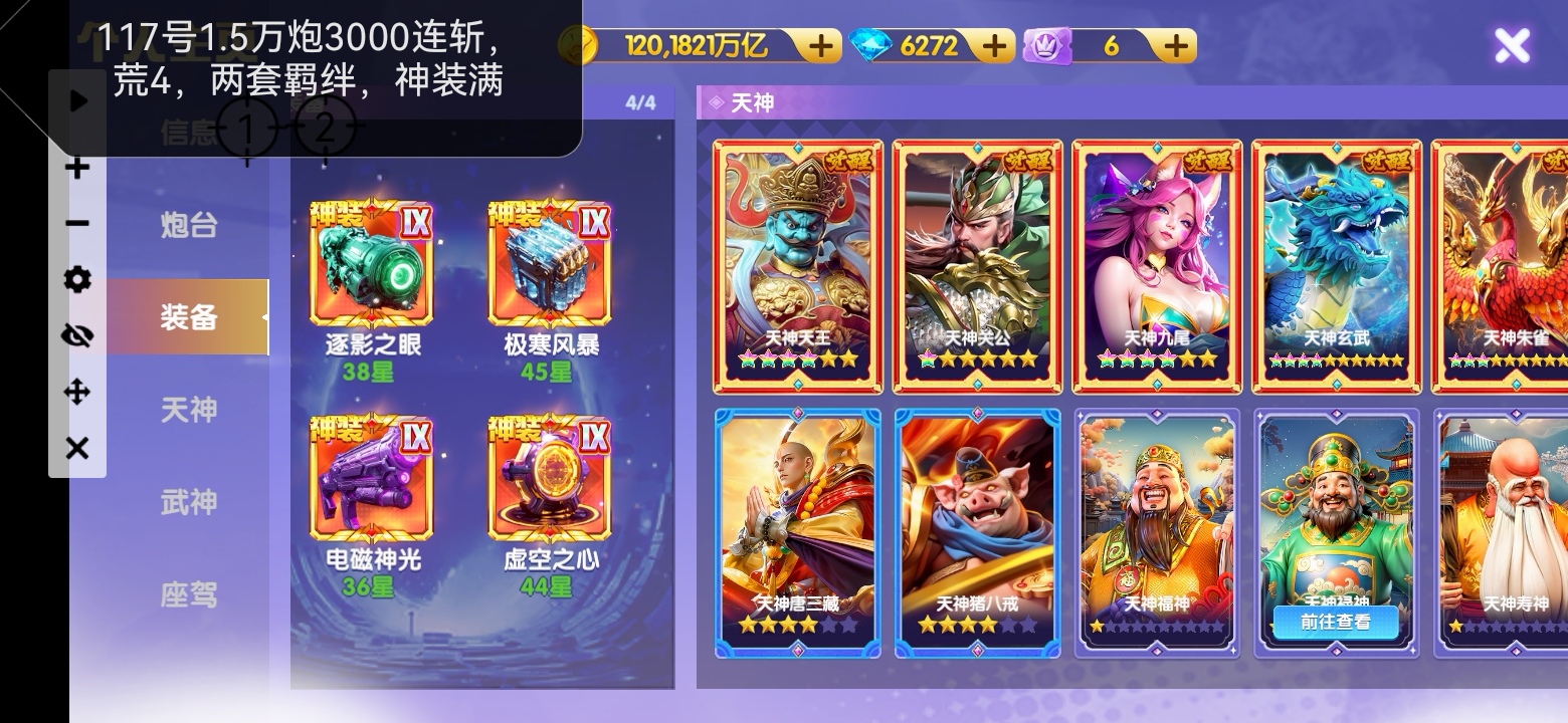 小米万炮神装破产号断。4神3荒双座驾。西游羁绊,天神745。资源多。详情看图
