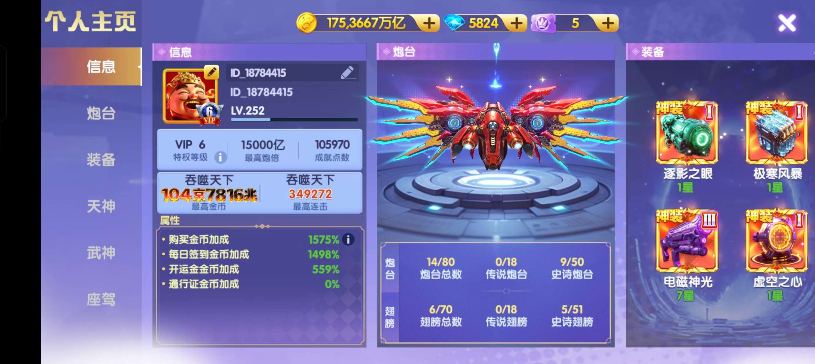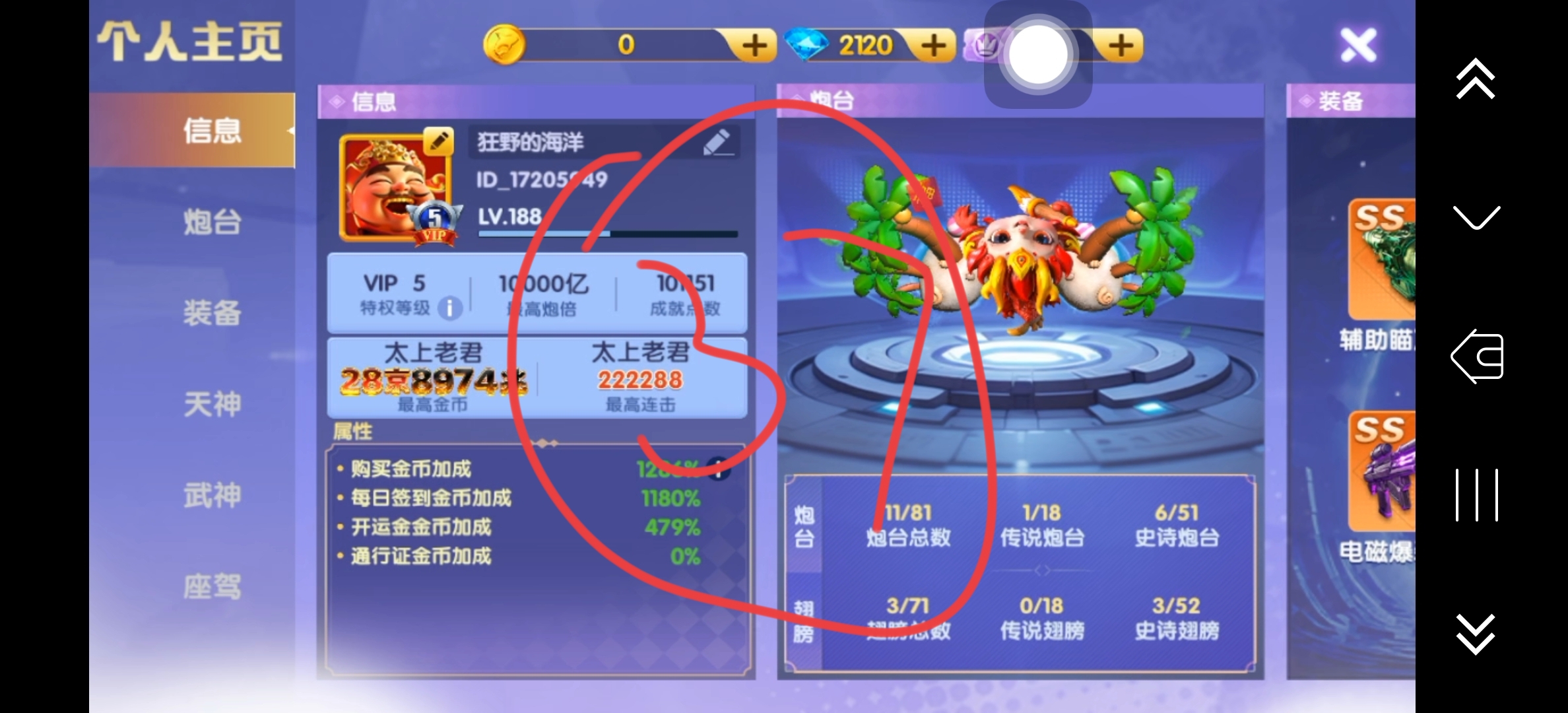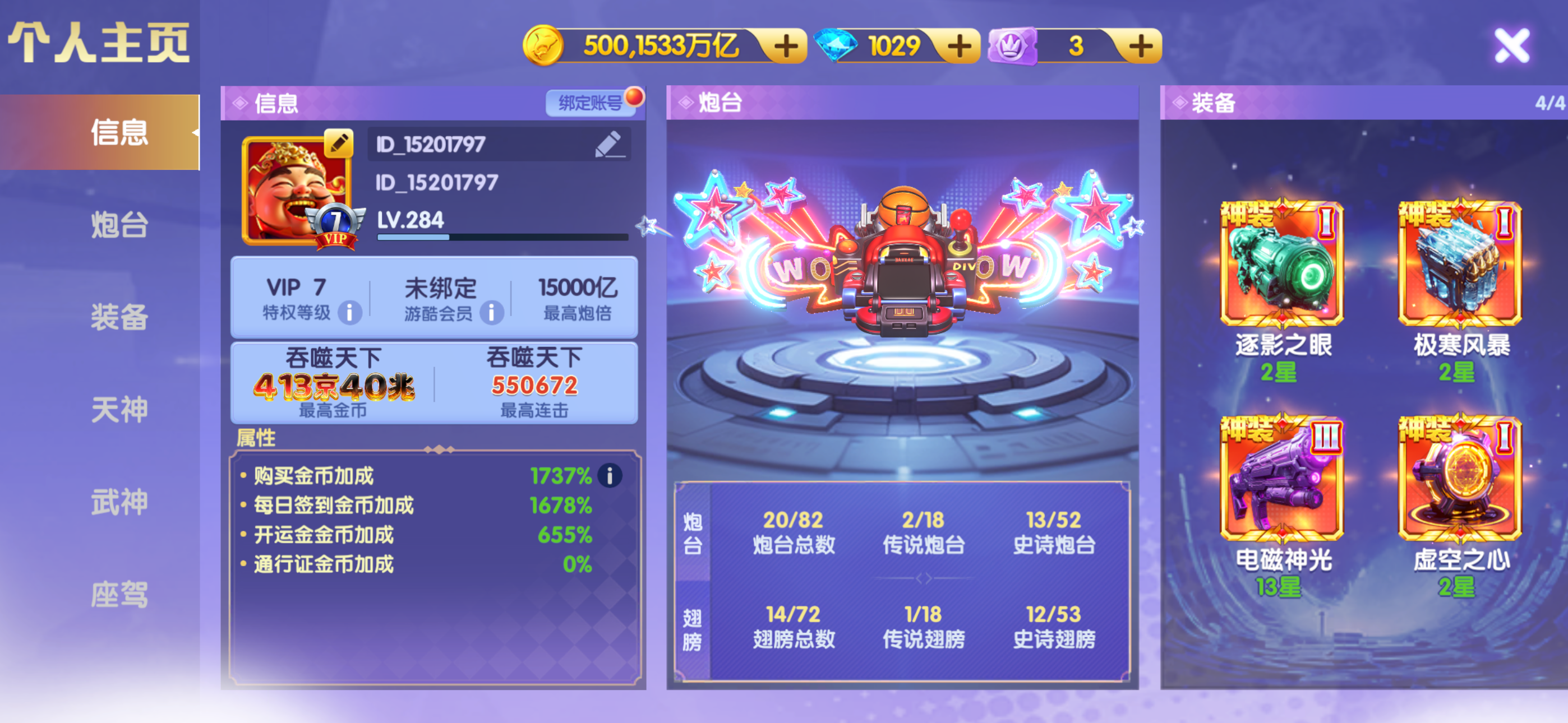 200京,2万炮,洪荒3,1200连斩,道具充足,换帮所有资料。上过1800京。