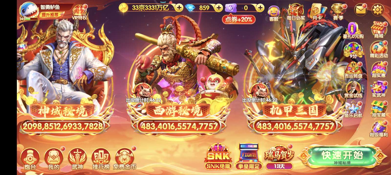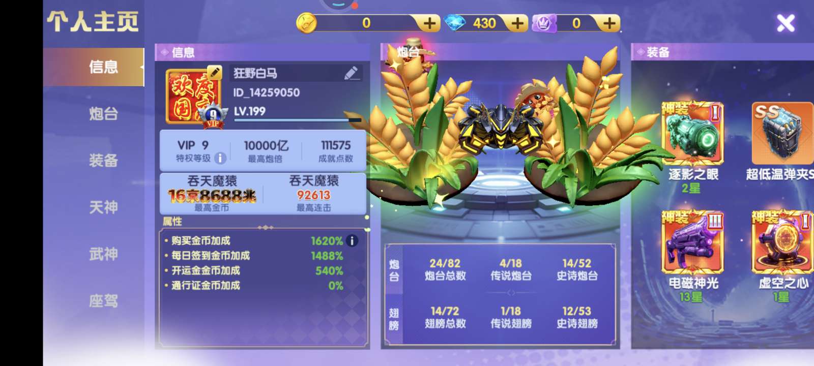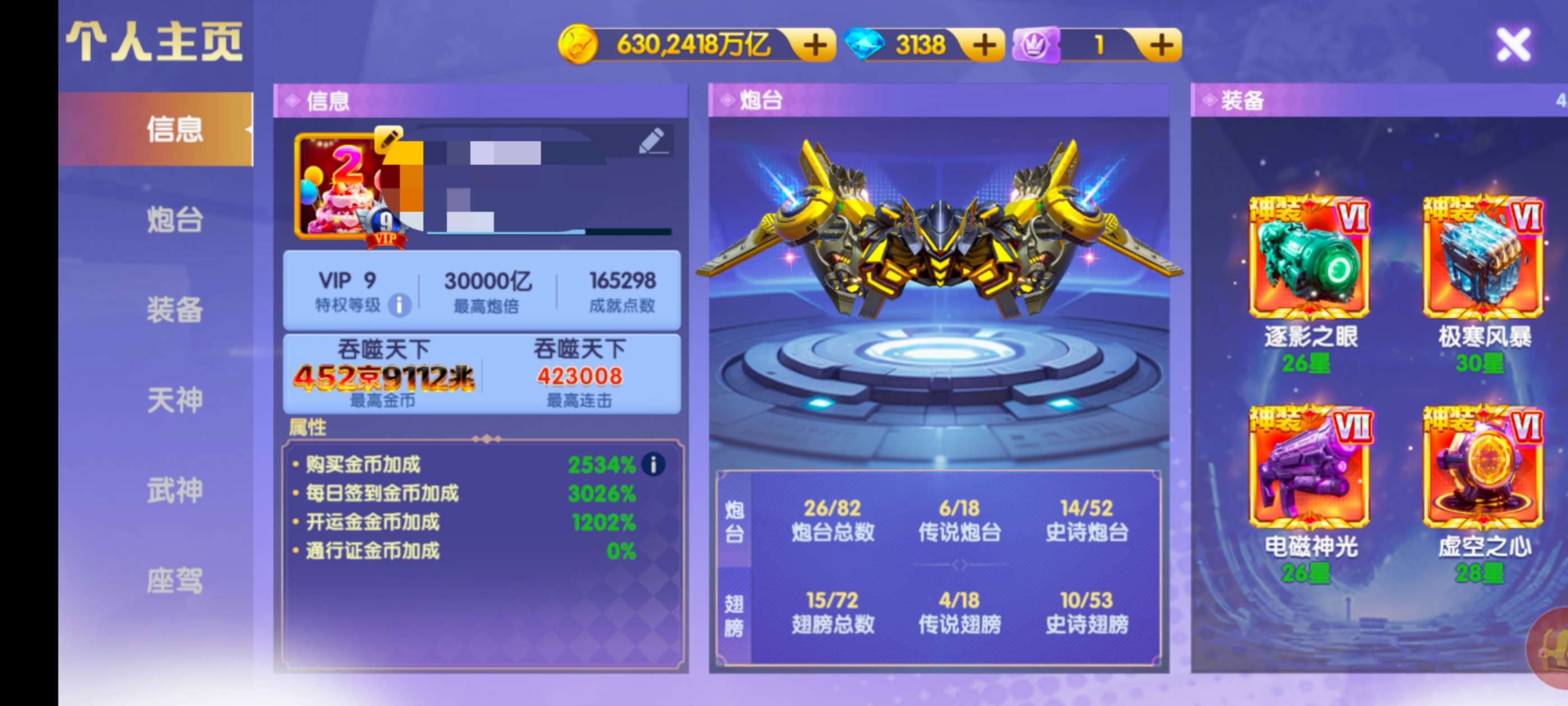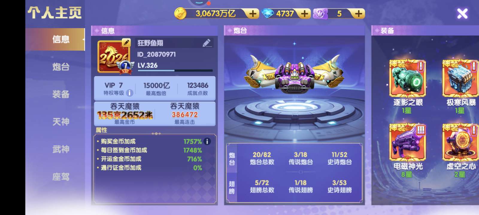 630兆,3万炮神装27连击。天神觉醒双粉龙,洪荒4级西游羁绊。18武神连击2400代羁绊。4座驾便
