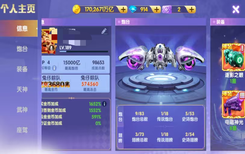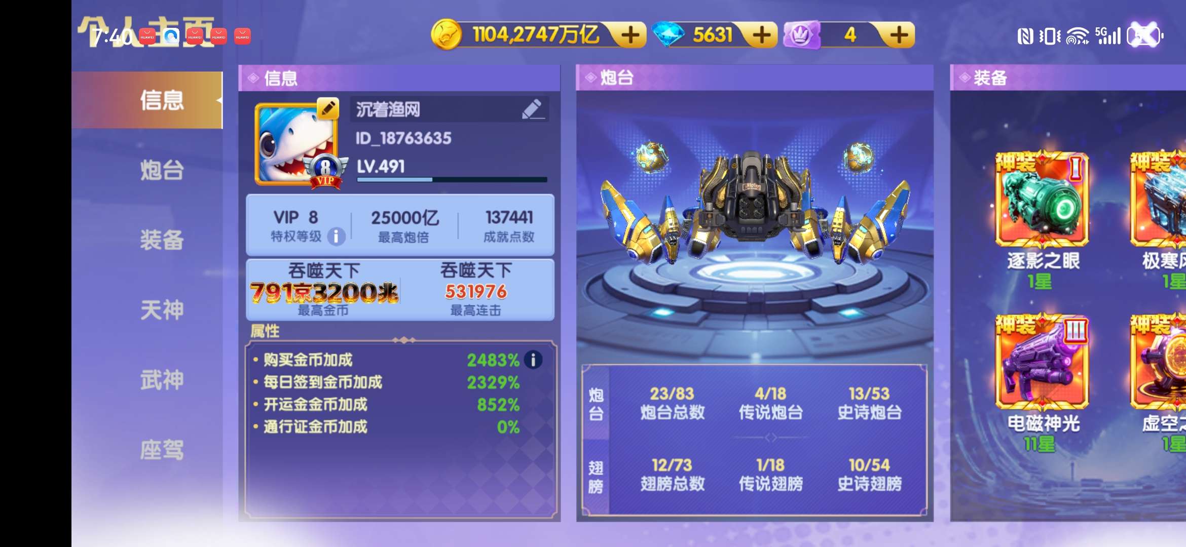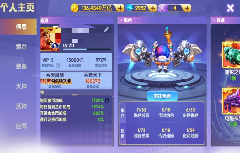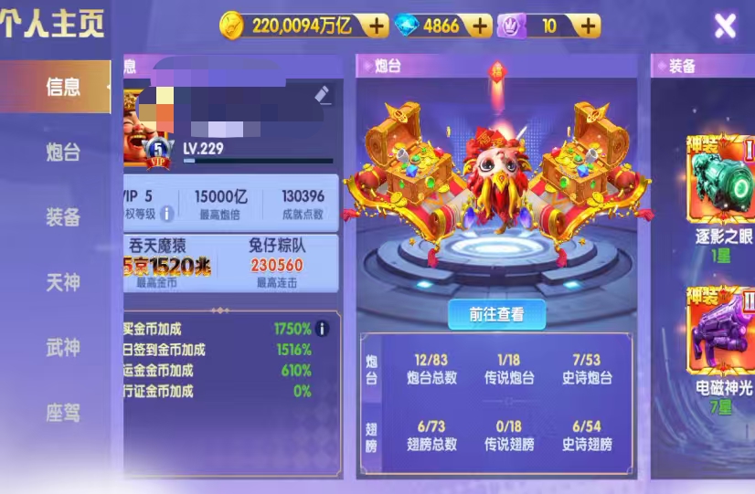 小米V7加成1923 110京神电 1.5万炮小分 天王5狐狸4⭐️三级洪荒连斩1200 5级座驾